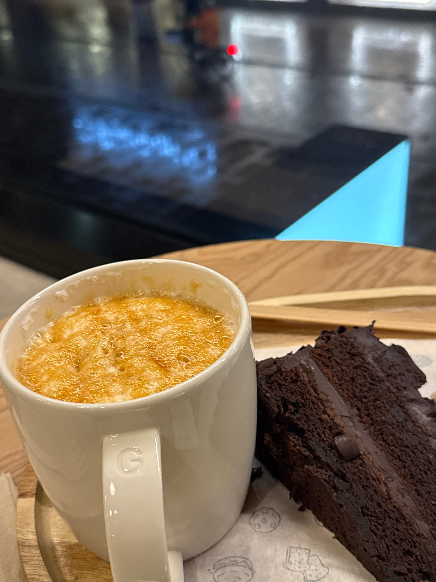 The image shows a cup of coffee next to a slice of chocolate cake on a wooden surface. The cup is white with a handle, and the coffee has a foamy top. The chocolate cake is dark brown with a chocolate…read more