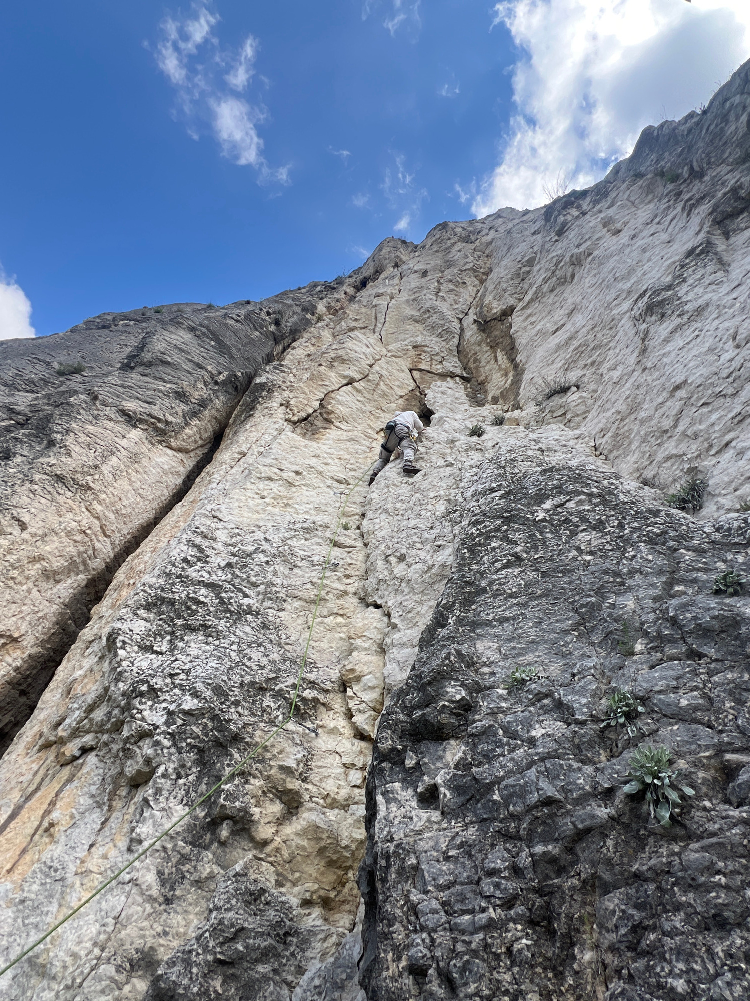 A low-angle, wide shot depicts a rock climber ascending a steep rock face. The climber, clad in light-colored clothing, is positioned about halfway up the rock. A climbing rope is visible, secured abo…read more