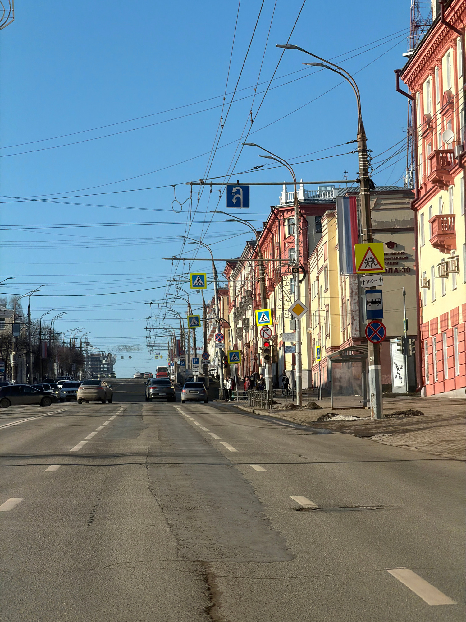 The image shows a street in Izhevsk, Russia. On the right, cars are parked along the road. Utility poles line the left, with a network of wires stretching overhead. Street signs are visible along the…read more