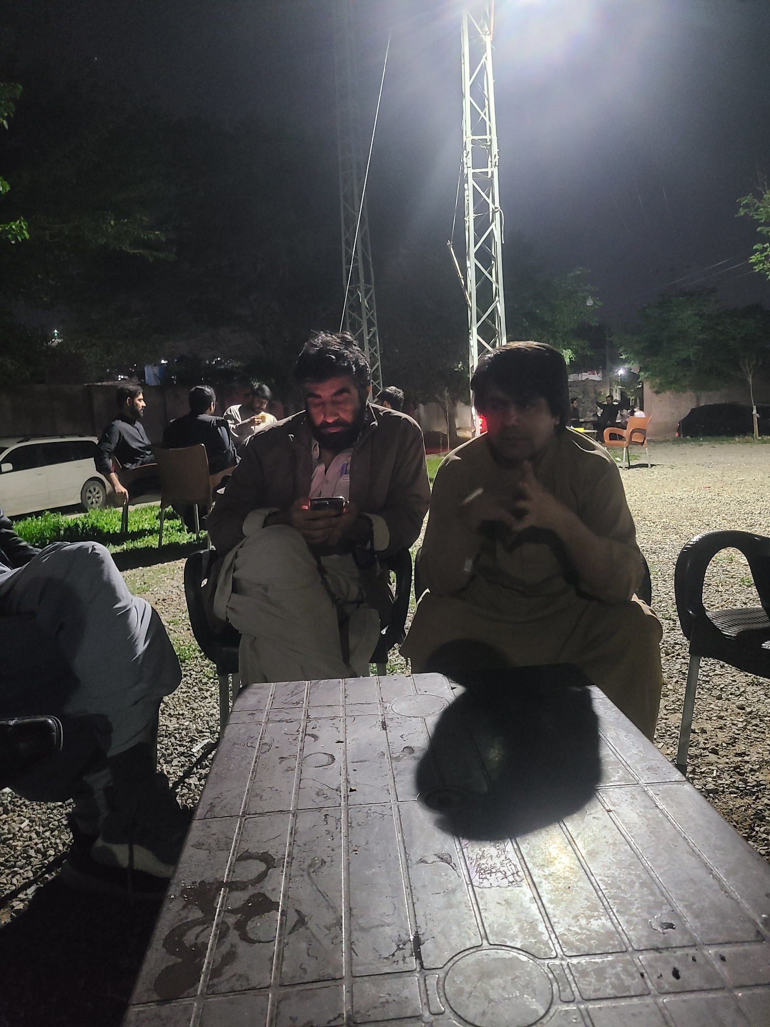 Two young men are sitting at a plastic table in an outdoor setting. One is wearing a light brown shirt and is holding a cell phone, while the other is wearing a darker brown jacket. There are other people in the background, along with a car and trees. There is also a streetlight visible. The table appears to be wet. The ground is covered in gravel. The location may be Quetta City Tehsil, Pakistan. | Open Wire