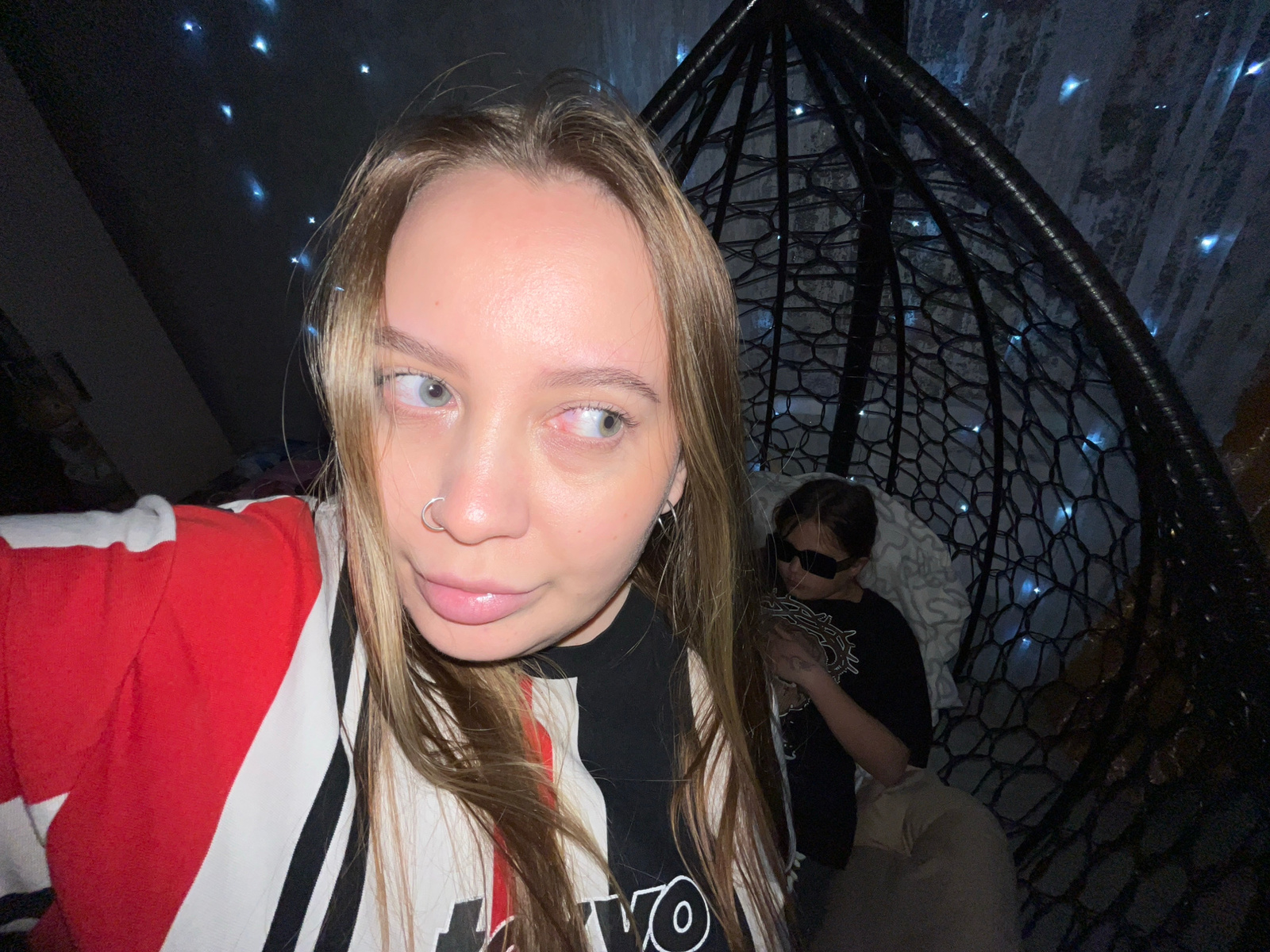 A person with light brown hair and a nose ring is shown from the nose up and rotated counter-clockwise. They are wearing a shirt with black, white, and red stripes. Behind them, another person is sitt…read more
