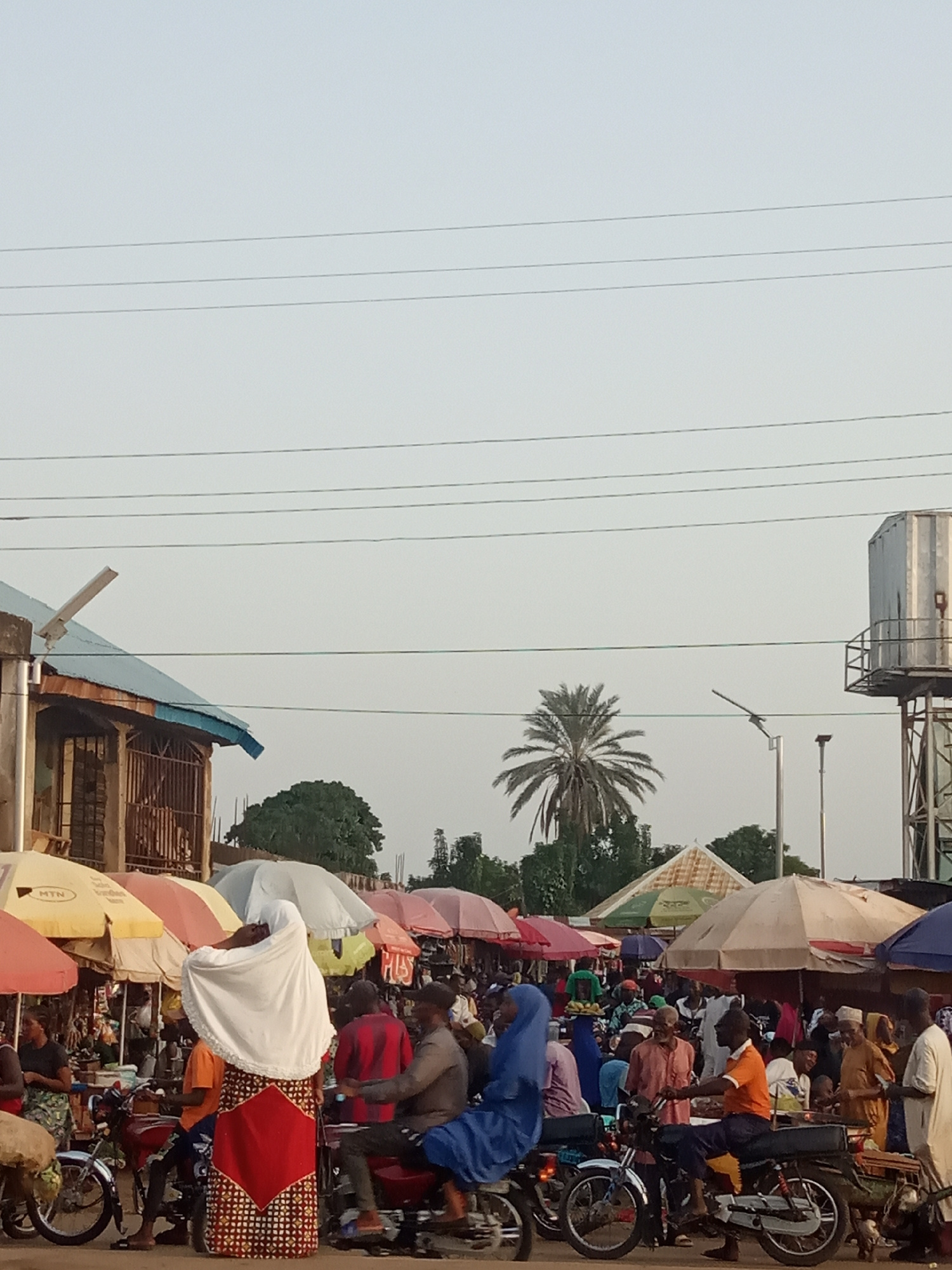 The image depicts a bustling marketplace in Akwanga, Nigeria. Numerous people are present, many of whom are riding motorcycles or standing amidst them. The market stalls are sheltered by colorful umbr…read more
