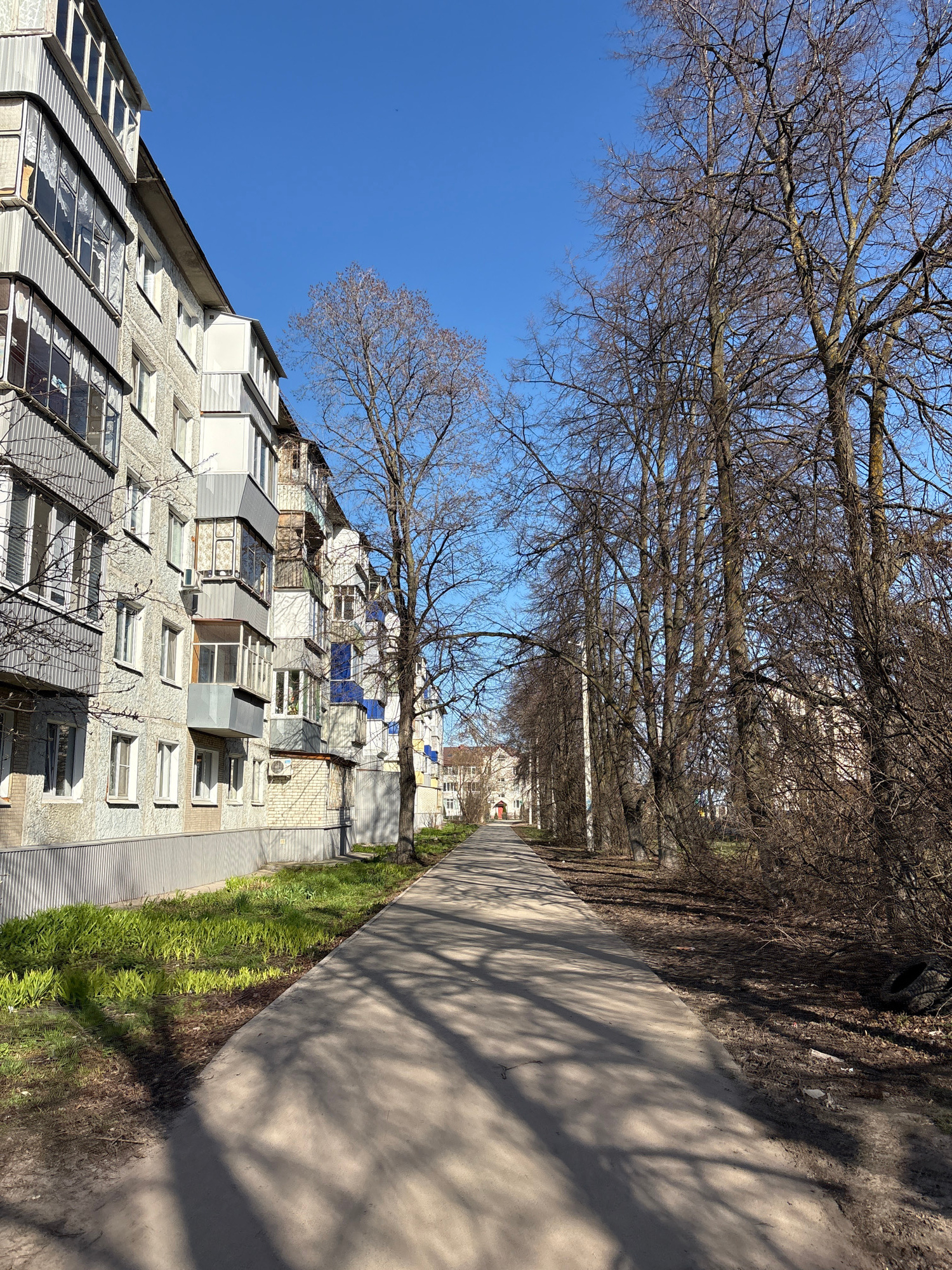 The image displays a sunny street scene in Ulyanovsk, Russia, featuring a residential building, a paved path, and bare trees under a clear blue sky. On the left, a multi-story apartment building stre…read more