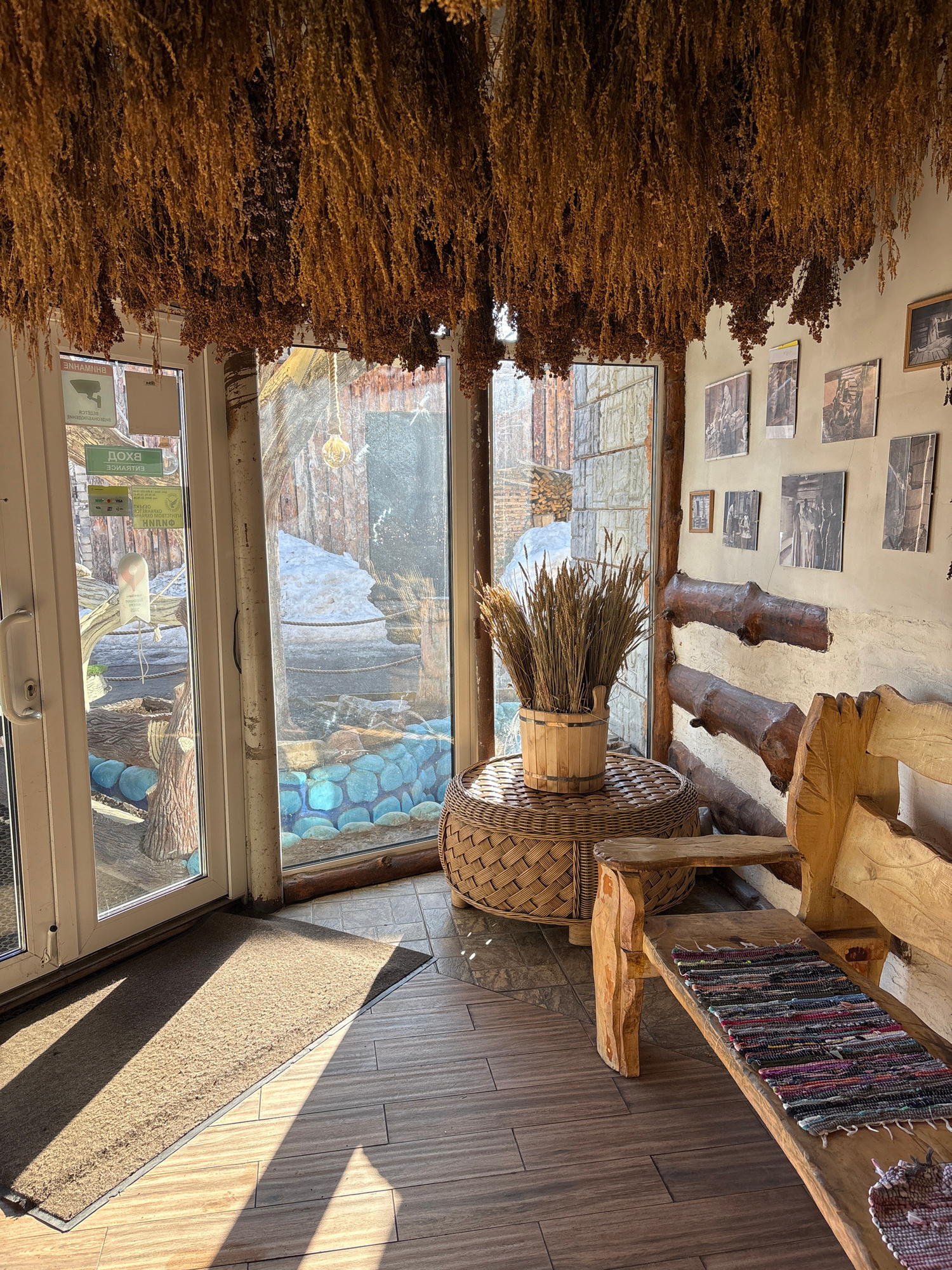 This image captures the interior of a rustic-style room or waiting area located in Bely Klyuch, Russia. The ceiling is densely covered with dried, light brown, fibrous plant material, creating a textu…read more