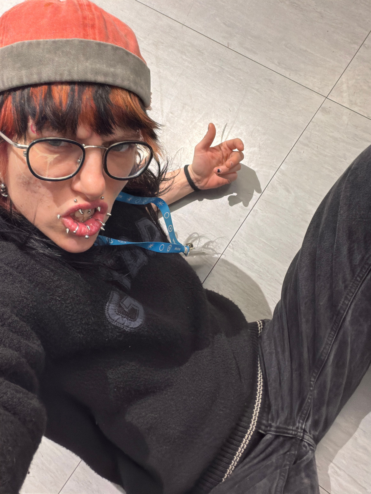An overhead photograph captures a person lying on a light grey tiled floor, looking directly up at the camera. The individual is dressed in a black fleece jacket with a grey patch featuring an abstrac…read more