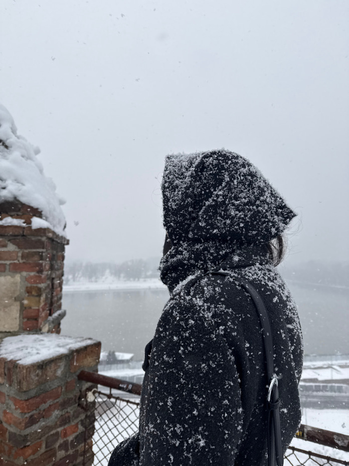 The image captures a winter scene at the Belgrade Fortress (Kalemegdan) in Belgrade, Serbia, during a snowfall. An individual, observed from the rear-right, stands facing a wide river. The person wear…read more