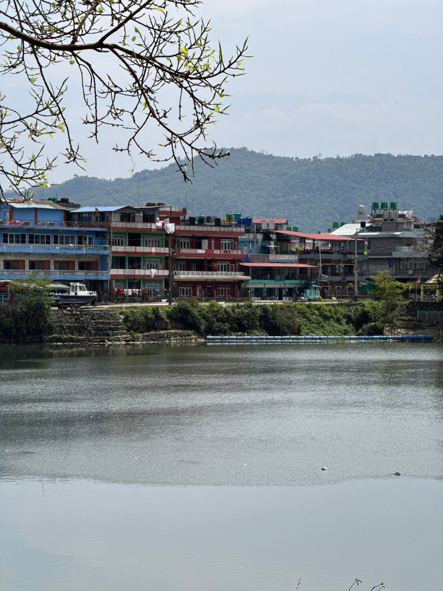 The image depicts a panoramic view of the Lakeside area in Pokhara, Nepal, bordering a large body of water, consistent with Phewa Lake. In the foreground, a tree branch with sparse green nascent leav…read more