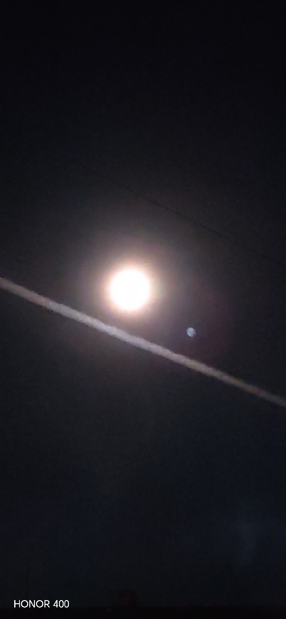 A photograph taken with an Honor 400 mobile device shows the moon in the night sky. The moon is a bright, circular light source in the center of the image, with a thin, horizontal contrail running acr…read more