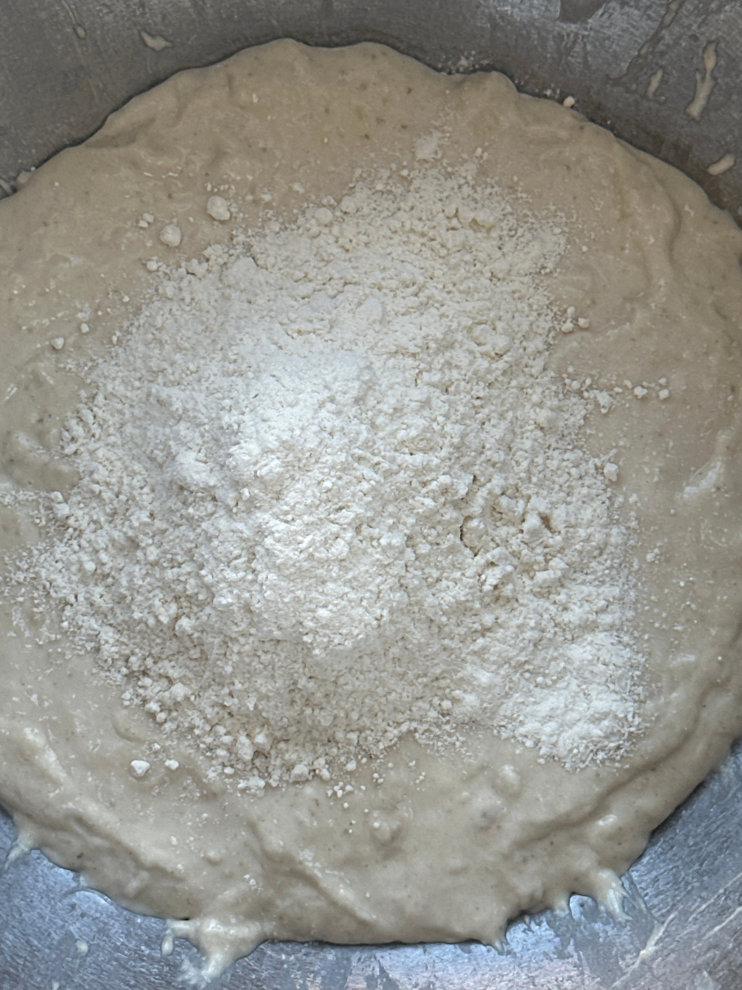 The image shows a close-up, top-down view of what appears to be dough in a metal bowl. The dough is light beige in color and covers most of the bowl's surface. A large pile of white flour sits in theβ¦read more