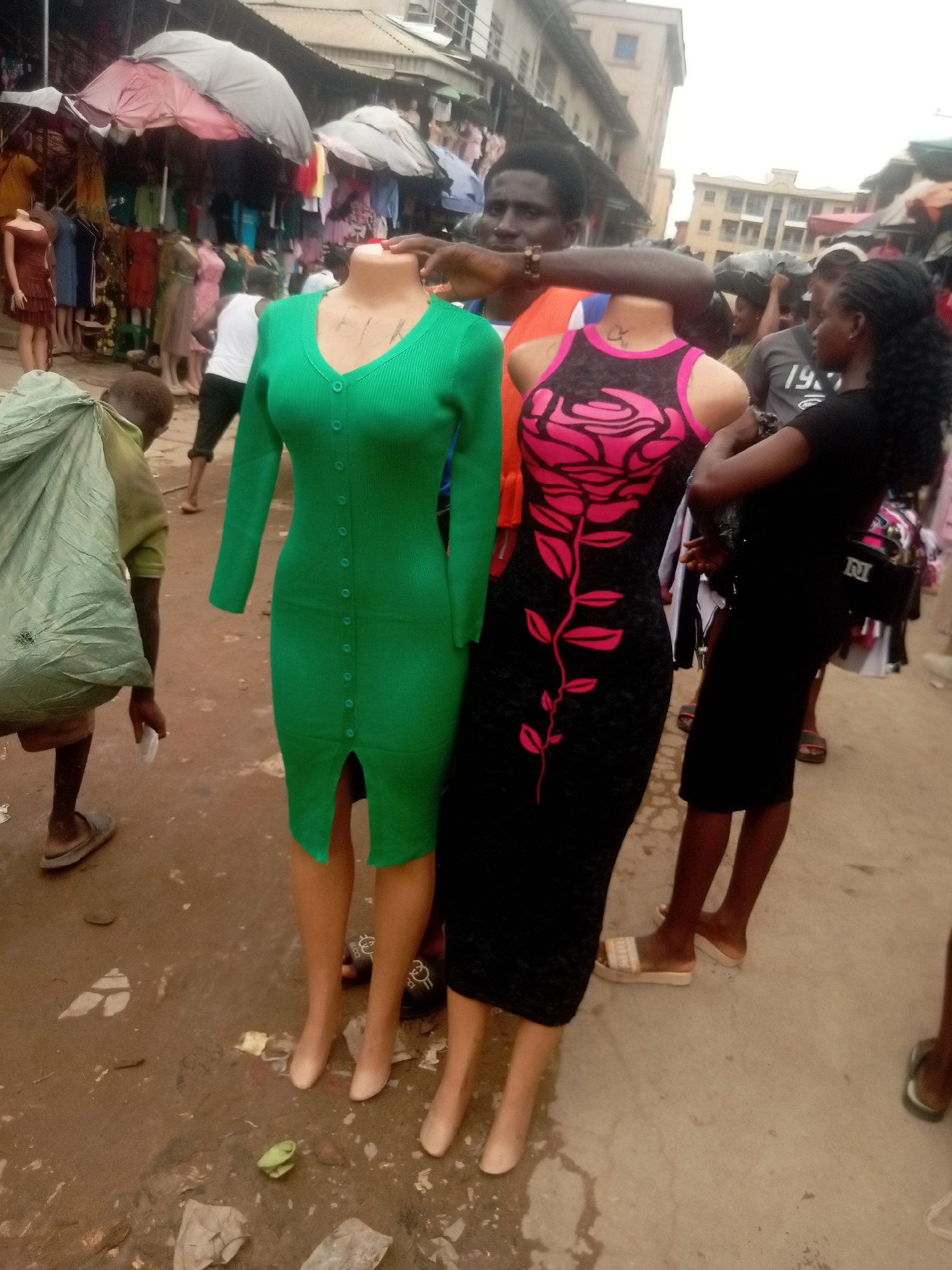 The image shows a market scene in Fegge, Nigeria. Two headless mannequins, one wearing a green button-down dress and the other a black dress with a pink rose design, stand in a busy outdoor market. A…read more