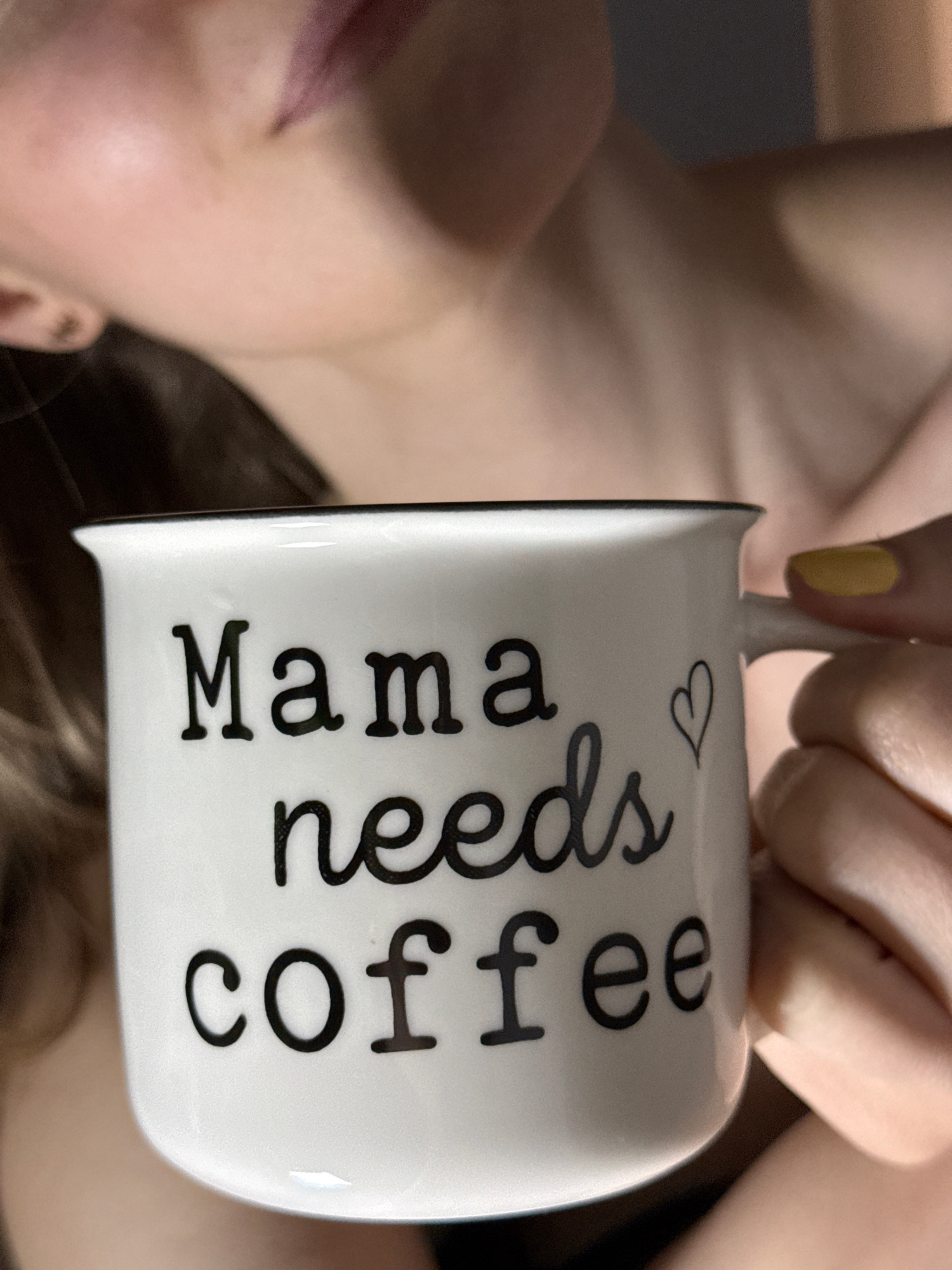 A person with fair skin is holding a white mug with the words "Mama needs coffee" written on it in black ink. The mug also has a small heart symbol above the word "Mama". The person's fingernails are…read more
