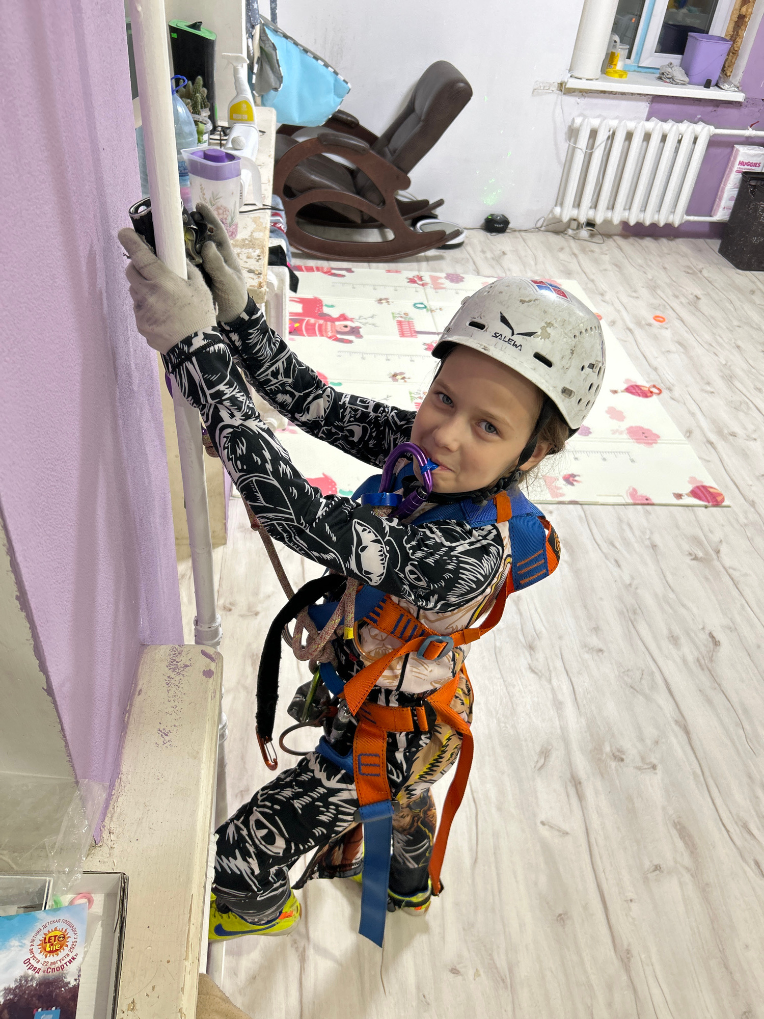 A young child, likely a girl, is captured in an indoor setting in Rusalevka, Russia, engaged in an activity resembling climbing or an obstacle course. She wears a white climbing helmet with the "SALEW…read more