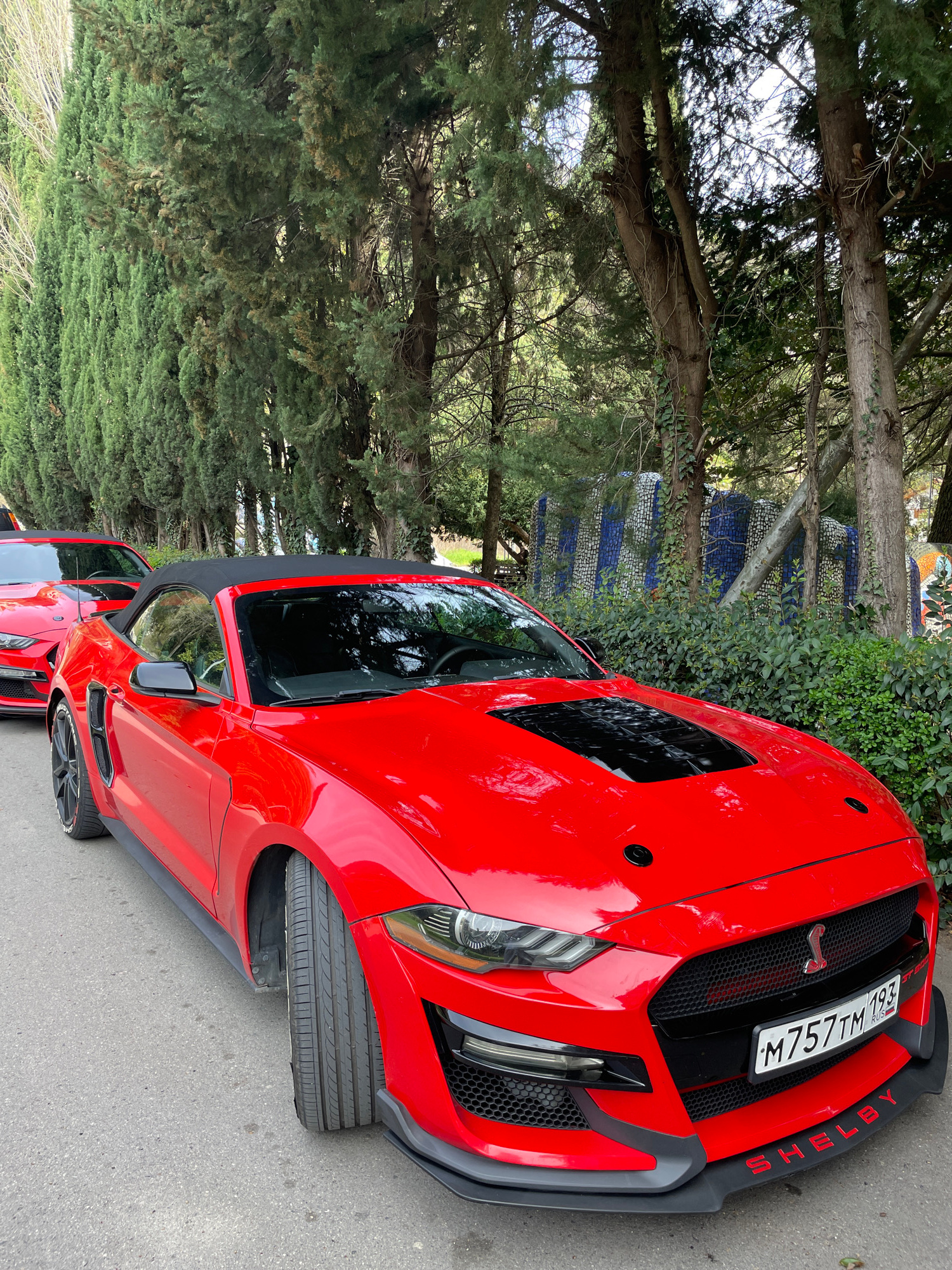 A red Shelby convertible car is parked on a paved road in Abaata, Abkhazia, near trees and foliage. The license plate of the car reads "M757TM 193 R.S.U." Part of a building decorated with blue and wh…read more