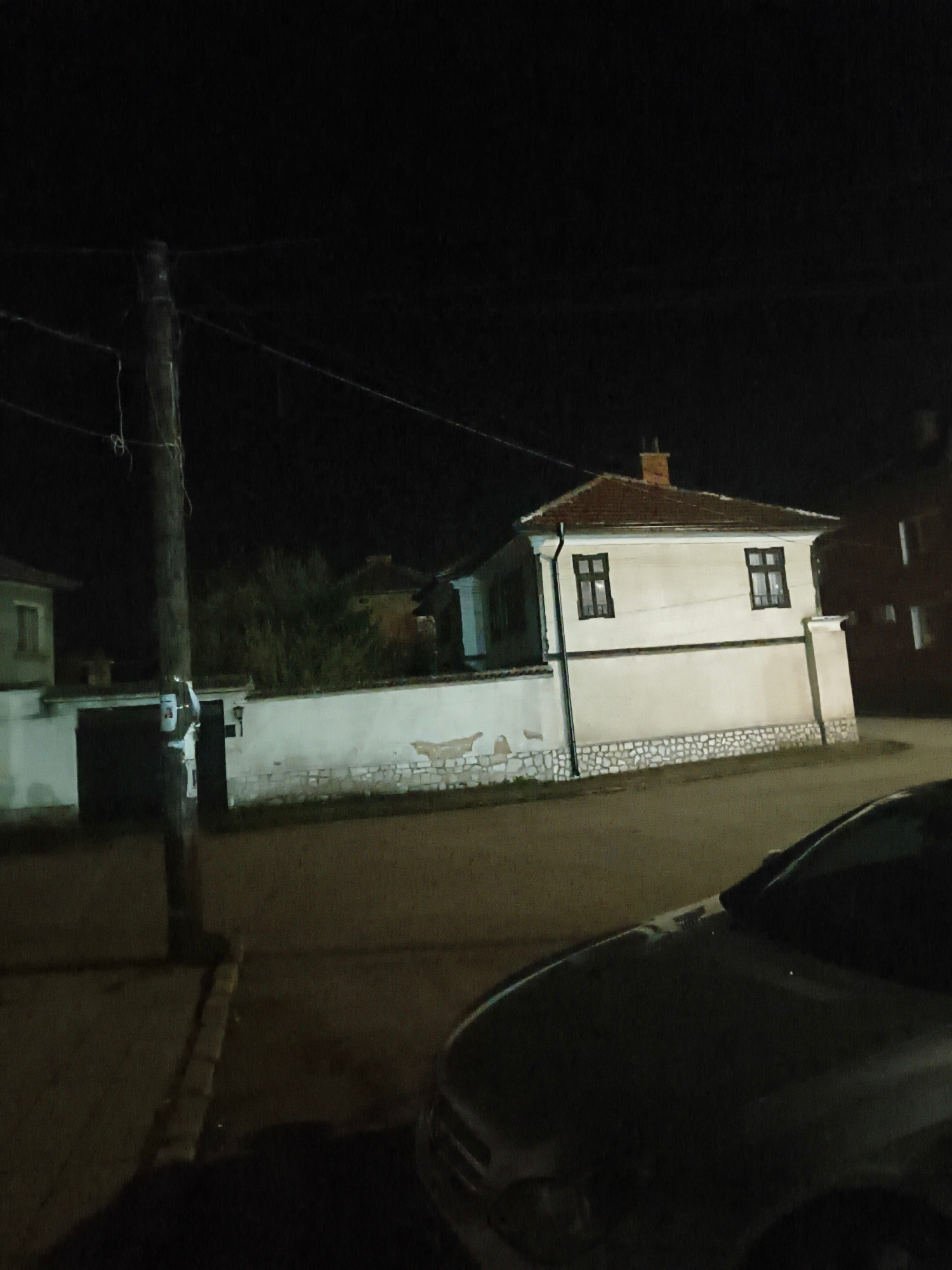 At night in Berkovitsa, Bulgaria, a poorly lit, rotated image shows a two-story building with a red-tiled roof and cream-colored walls. The building has two visible windows on the upper floor. A secti…read more