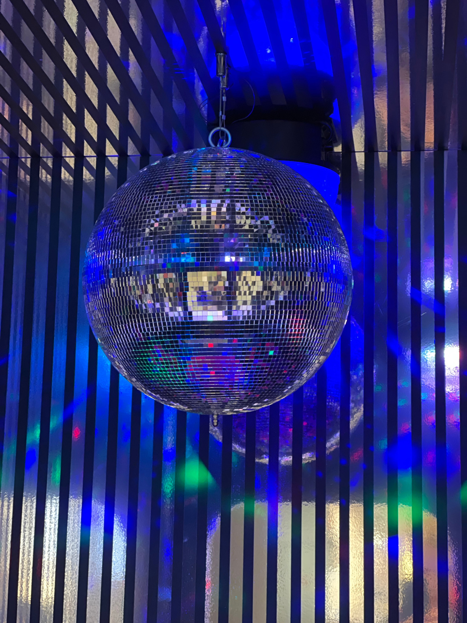 A large, spherical disco ball dominates the center of the image, brightly lit and reflecting a spectrum of colors. The disco ball is covered in small, square mirrored tiles, which scatter beams of blu…read more