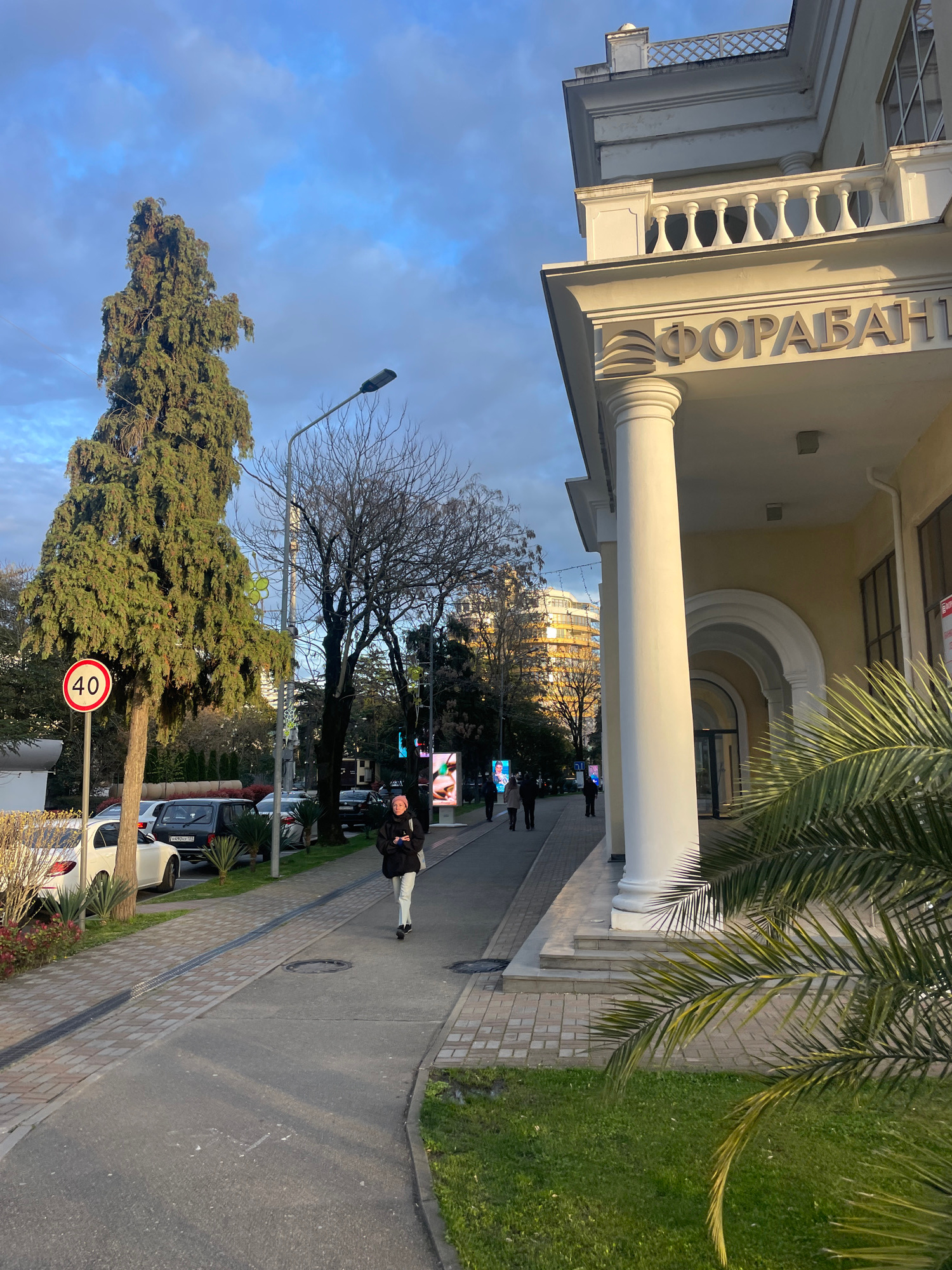 The image captures a street scene in Sochi, Russia, featuring a portion of a building with the word "ФОРАБАНК" (Forabank) displayed prominently. A classical-style column supports the building's struct…read more
