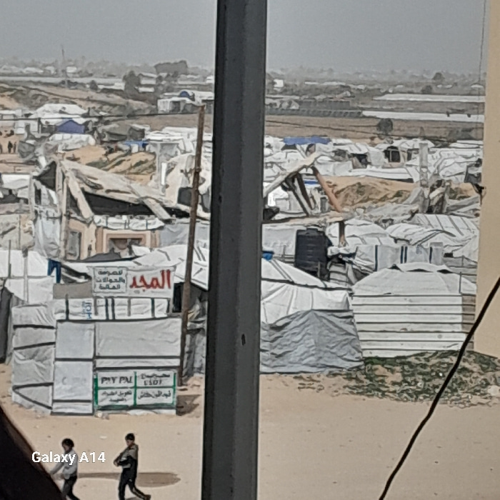 The image displays a densely packed, temporary settlement within the city of Khan Yunis, Palestinian Territory, viewed from an elevated perspective. Numerous makeshift shelters, predominantly construc…read more