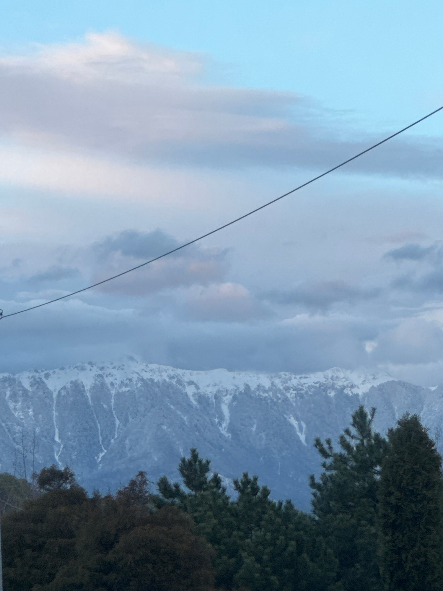 The image depicts a mountainous landscape partially obscured by clouds and trees. The sky transitions from light blue to pale grey with cloud formations. A power line diagonally crosses the frame. Theβ¦read more