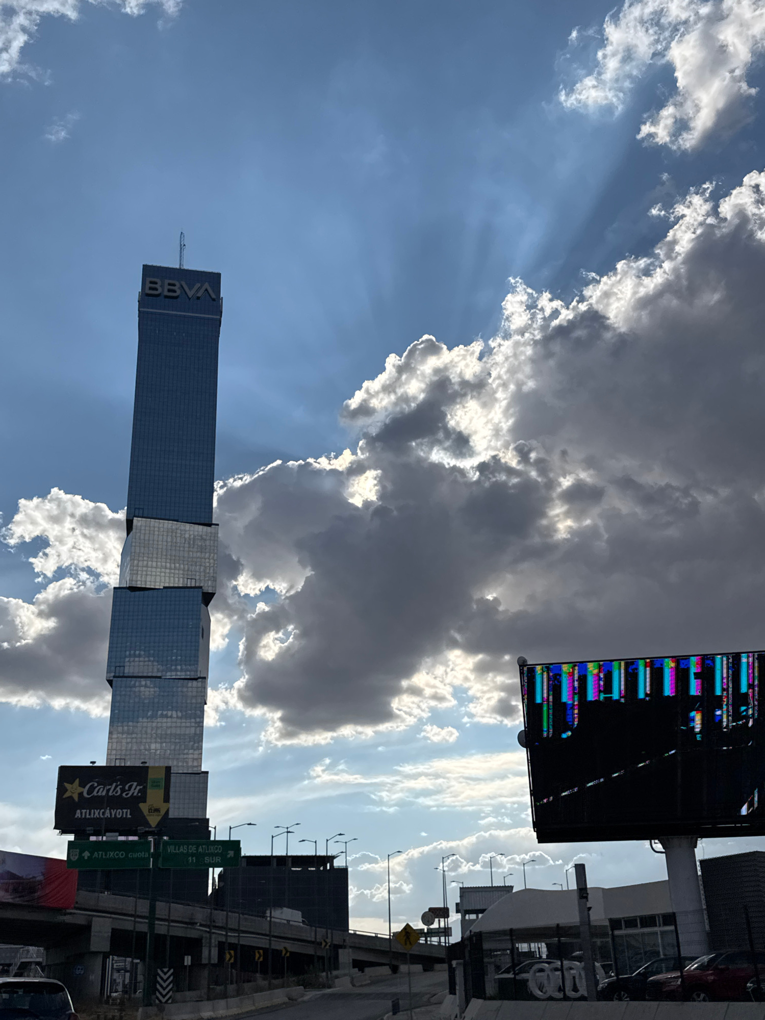 The image shows a view looking upwards in Heroica Puebla de Zaragoza, Mexico. Prominent is the BBVA Tower, a tall, modern skyscraper with a blue-grey facade. To the right of the tower is a large, mult…read more