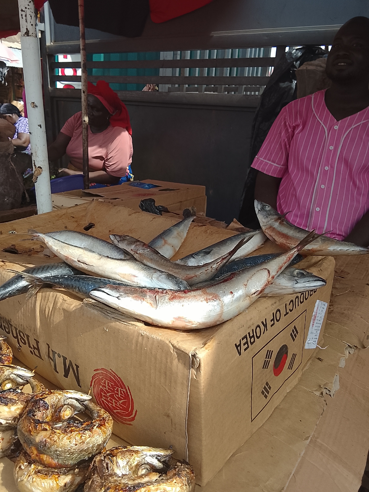 The image captures a scene at a fish market in Akwanga, Nigeria. Fresh mackerel, some with traces of blood, are piled on top of a cardboard box labeled "PRODUCT OF KOREA" and "M.H. Fisher". Dried, rou…read more