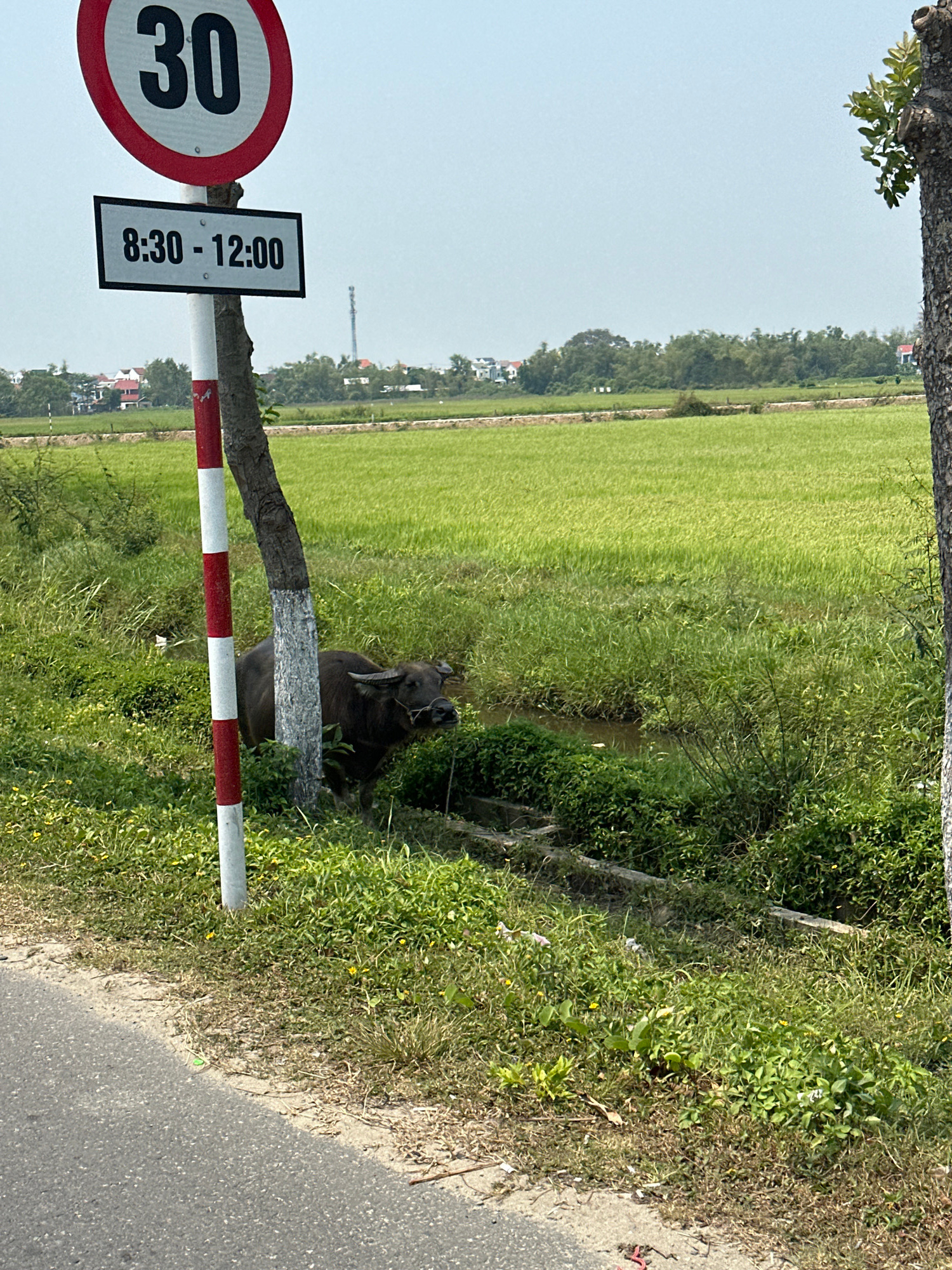 A rural scene in Hội An Ward, Vietnam, features a water buffalo partially obscured by a barrier with a red and white striped pole, a speed limit sign reading "30" (likely kilometers per hour), and a s…read more