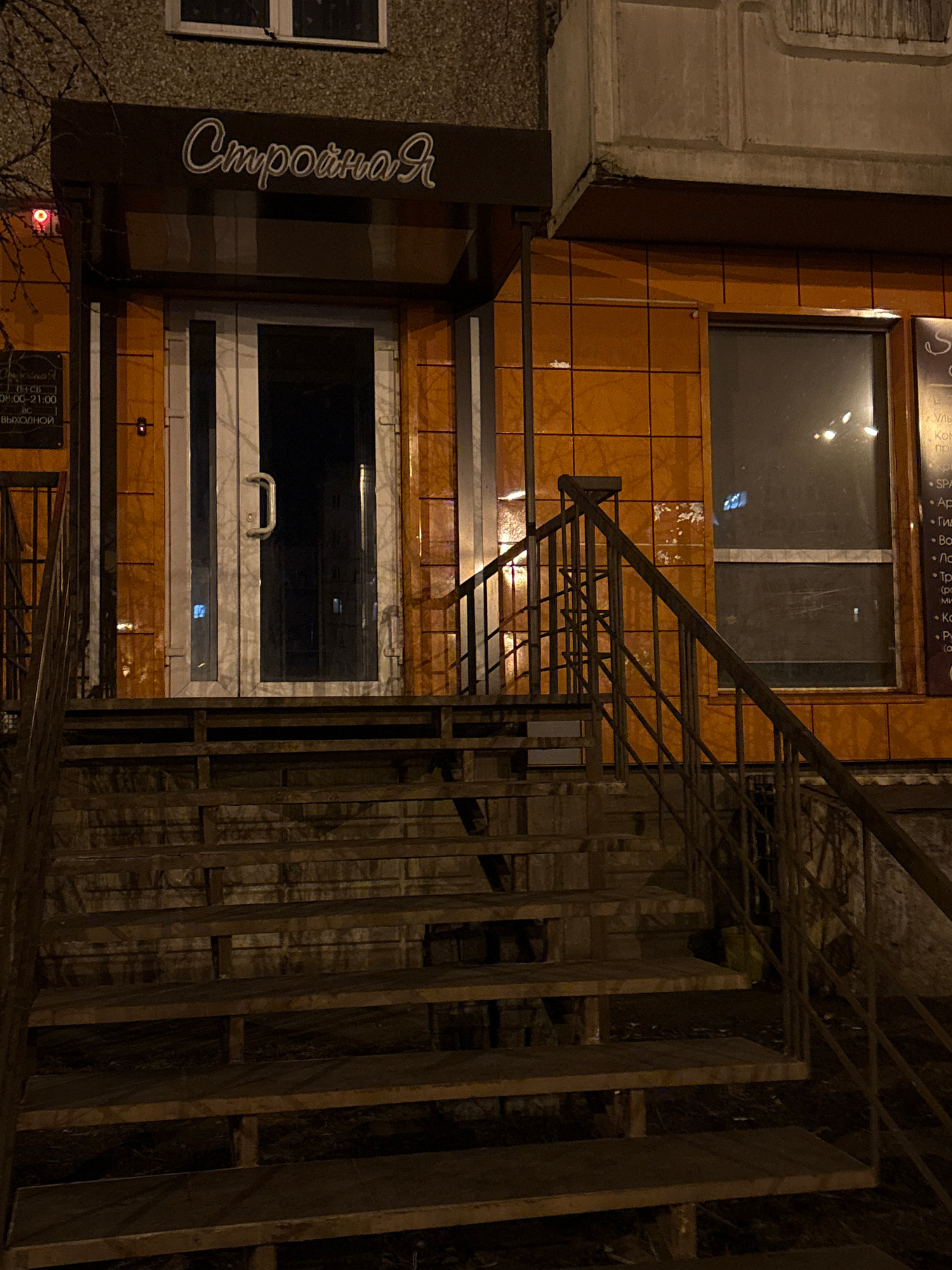 This image depicts the exterior of a building with a sign in Russian that reads "Стройная," which translates to "Slender" or "Slim." The building is constructed with a mix of orange and white panels.…read more