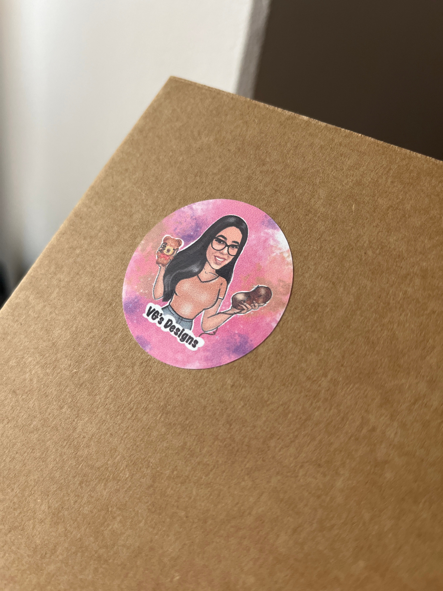 A sticker is adhered to a brown cardboard box. The sticker is circular, pink and purple hued, with a cartoon image of a woman in the center. The woman has dark hair, wears glasses, and has a light tanβ¦read more