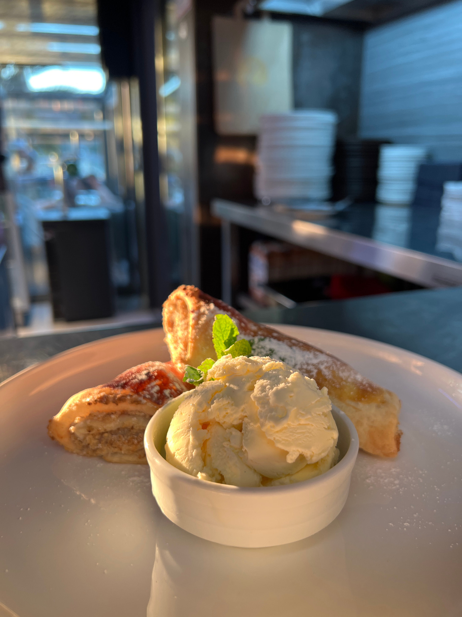 The image shows a dessert on a white plate, likely in a restaurant setting. The dessert consists of pastry, dusted with powdered sugar, accompanied by a small bowl of ice cream and garnished with fres…read more
