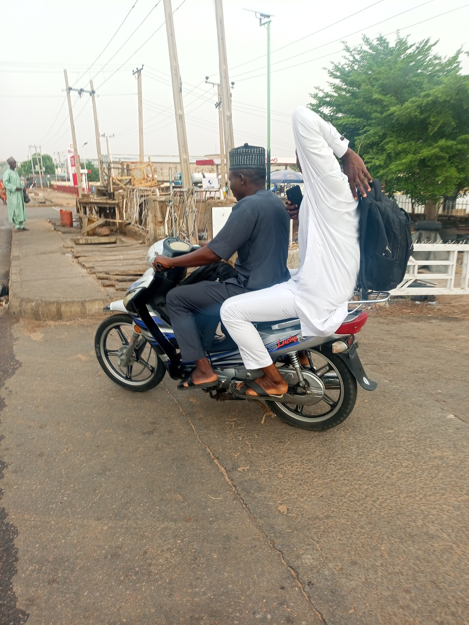 Two men ride a motorcycle on a paved road. The driver wears a dark gray shirt and pants, a black skullcap, and sandals. The passenger wears a long-sleeved white robe and white pants and carries a blac…read more