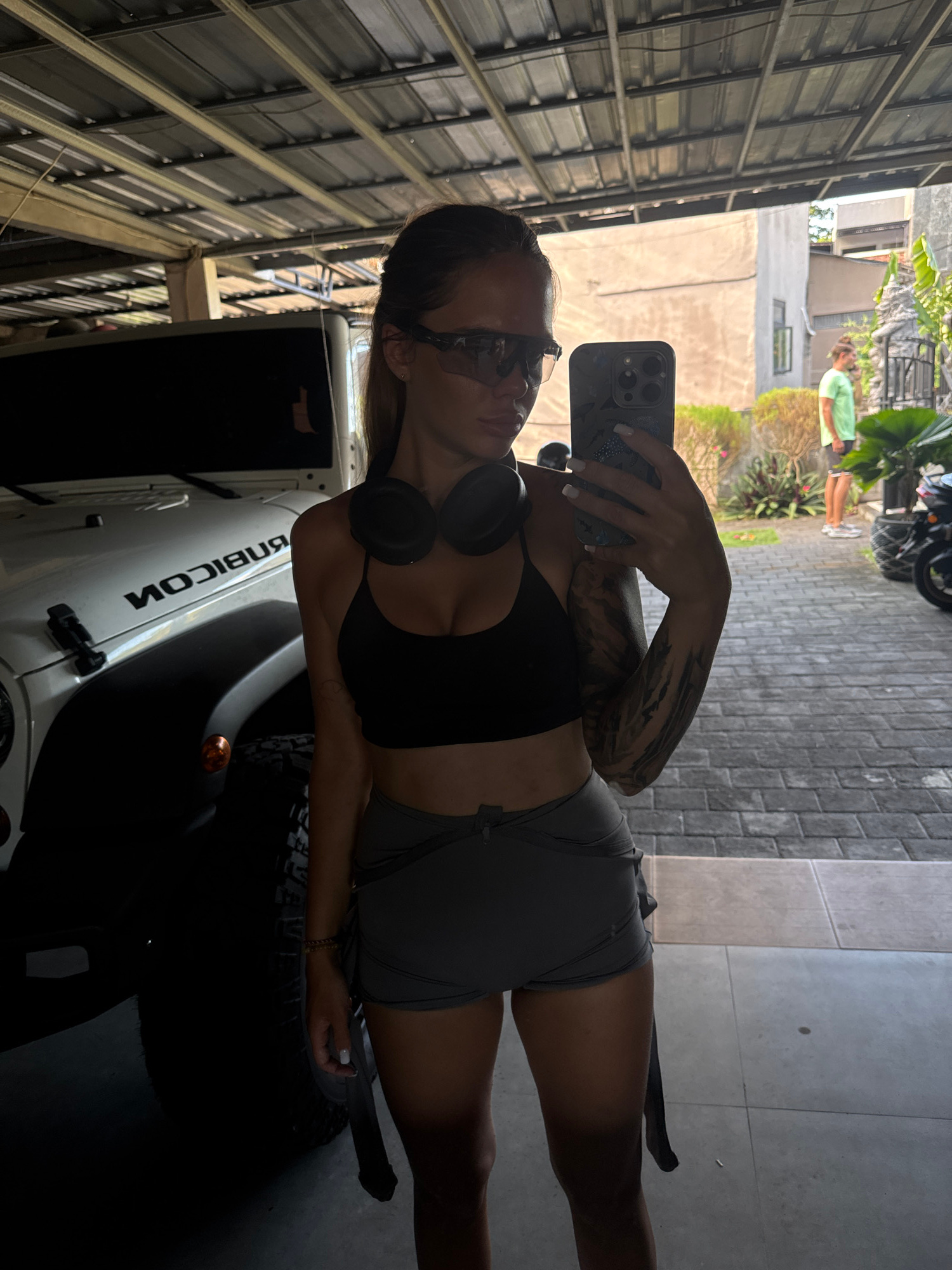 A woman stands facing left in what appears to be a garage or carport-like structure, using her phone to take a selfie. She has sunglasses on, headphones around her neck, a black sports bra, and gray s…read more