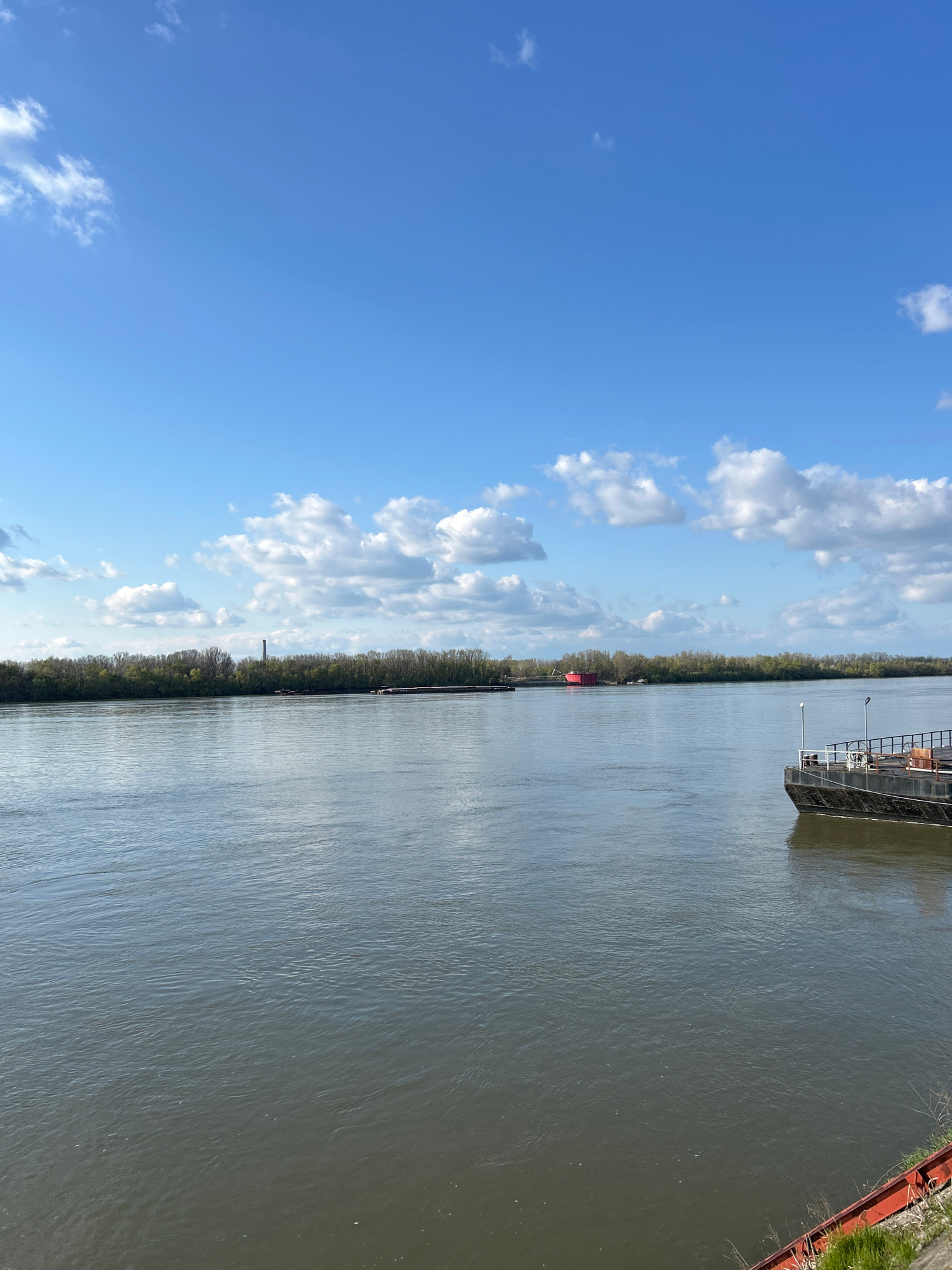 The image depicts a waterway in Ruse, Bulgaria, likely the Danube River, separating Bulgaria and Romania. The scene includes a bright blue sky with cumulus clouds on the left, with a view of the river…read more