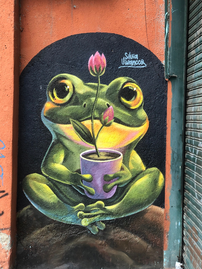 A mural on an orange wall depicts a green frog holding a lavender pot with a pink flower sprouting from it. The frog has large yellow eyes and is set against a black oval. The artist's signature, "Sil…read more