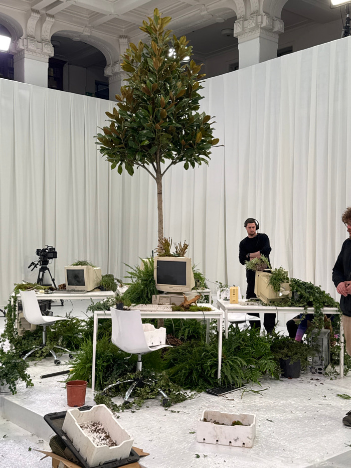 This image depicts a contemporary art installation within a large, high-ceilinged indoor event space or gallery in Milan, Italy. The background features white, floor-to-ceiling drapes that partially o…read more