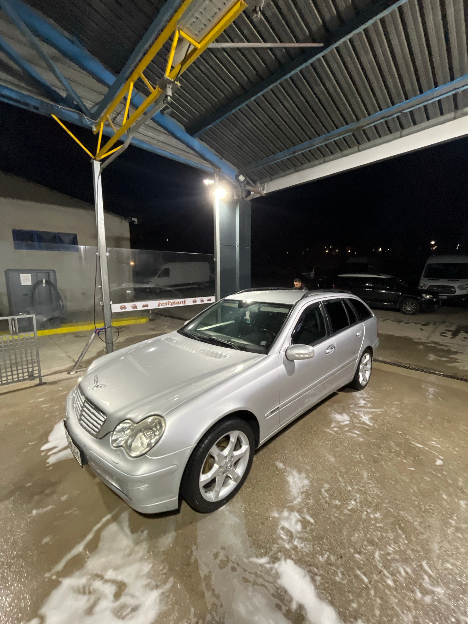 The scene depicts a silver Mercedes-Benz car undergoing a wash at a car wash facility. The location is presumed to be Karlovo, Bulgaria. The car is partially covered in soap suds. The environment feat…read more