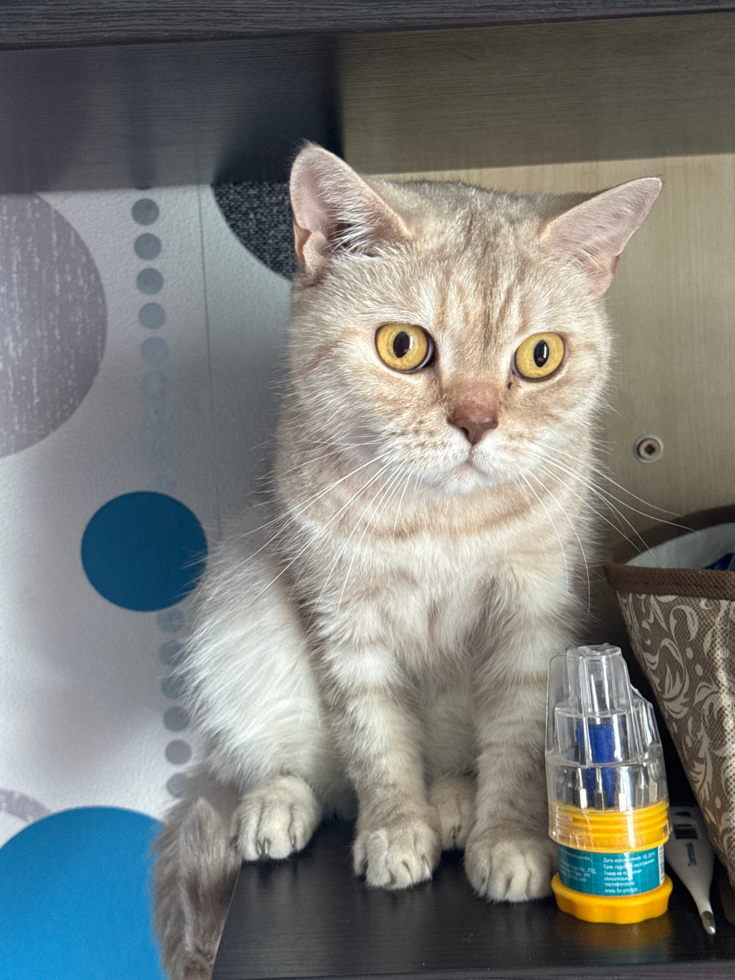 A tan and white tabby cat with large yellow eyes is lying on a surface with a pattern of light gray and blue circles, inside a dark-colored drawer. A clear plastic pill container with a yellow cap, a…read more