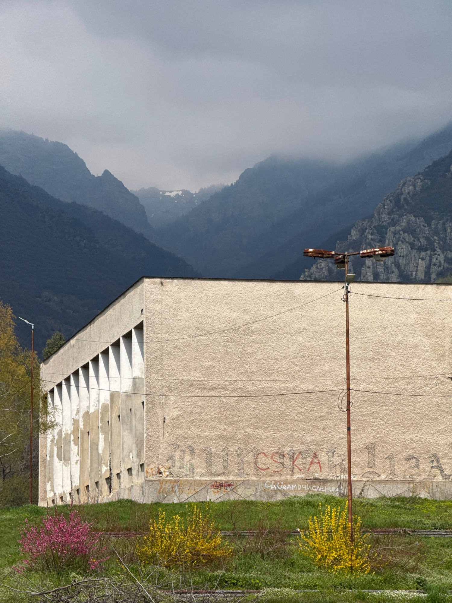 The image depicts an abandoned concrete building next to a mountainous landscape. The building has graffiti on its exterior wall and a series of triangular concrete projections. A rusted metal pole ex…read more
