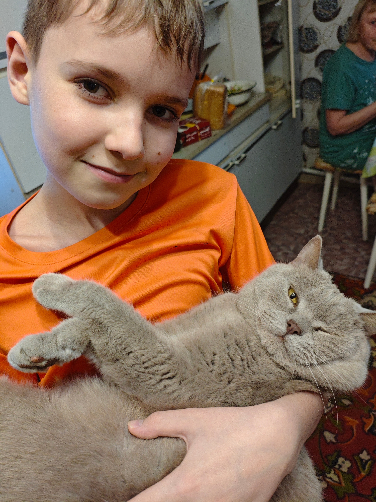 A boy with short brown hair, wearing an orange t-shirt, is holding a grey cat. The cat has one eye closed. In the background, a woman in a green t-shirt sits on a stool at a table. A kitchen area is v…read more