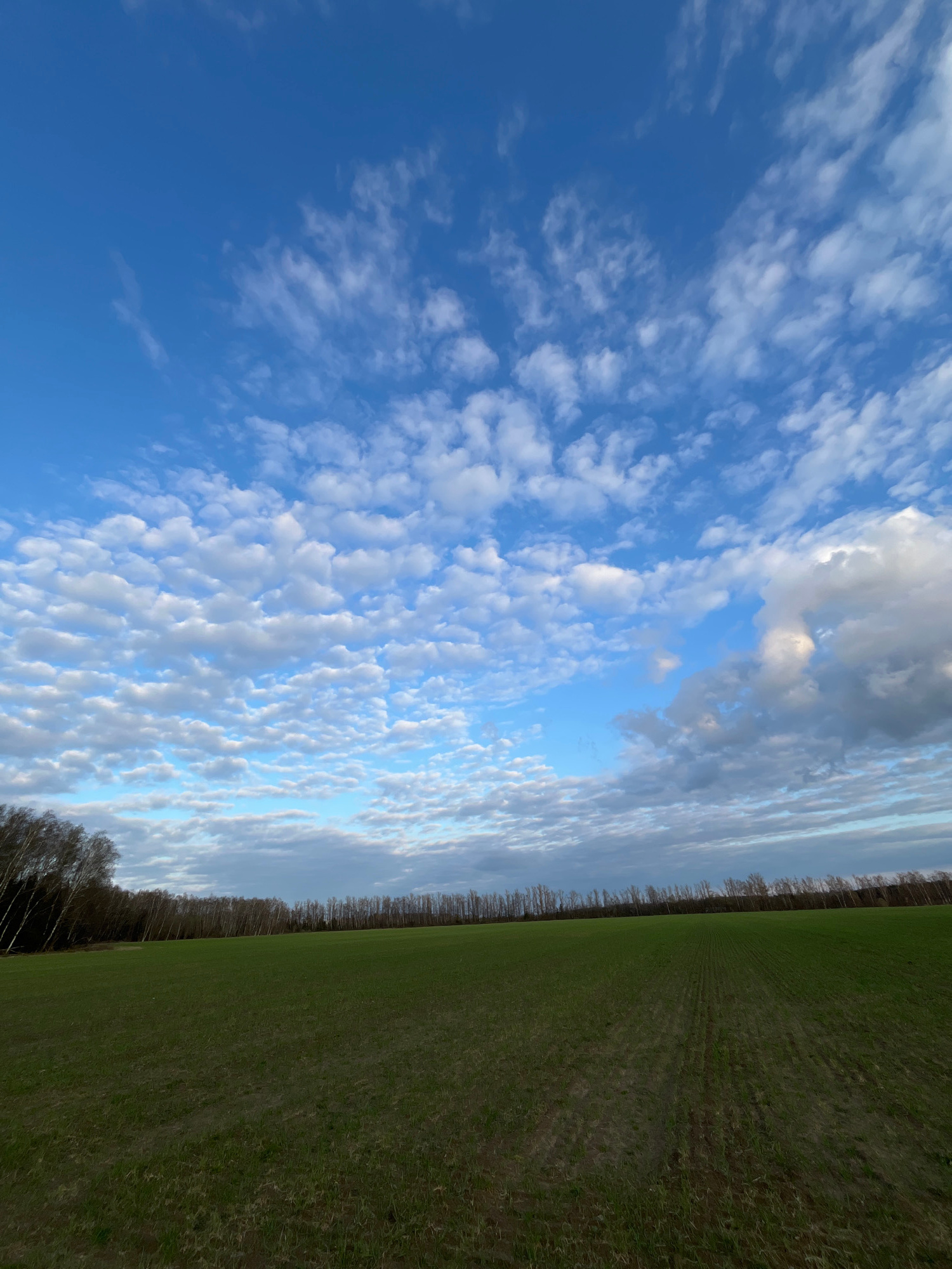 The image presents a view of the sky and a field. The sky is predominantly blue, filled with numerous small, white, puffy clouds, potentially altocumulus. In the upper right, the sky transitions to sh…read more