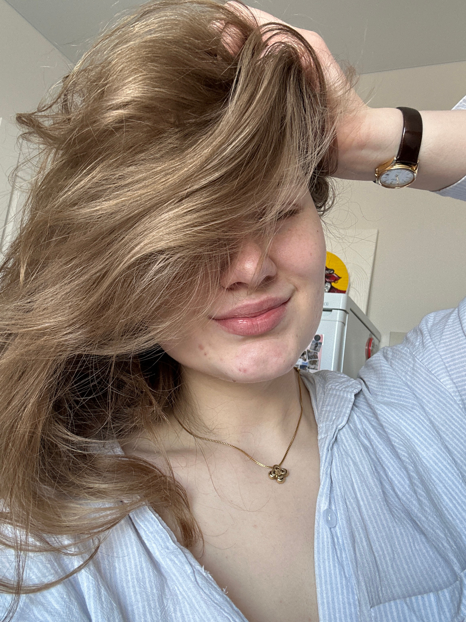 A woman with long, blonde hair is positioned in the frame. She is wearing a light blue, striped button-down shirt. A gold necklace with a flower-shaped pendant rests on her chest. A brown leather wris…read more