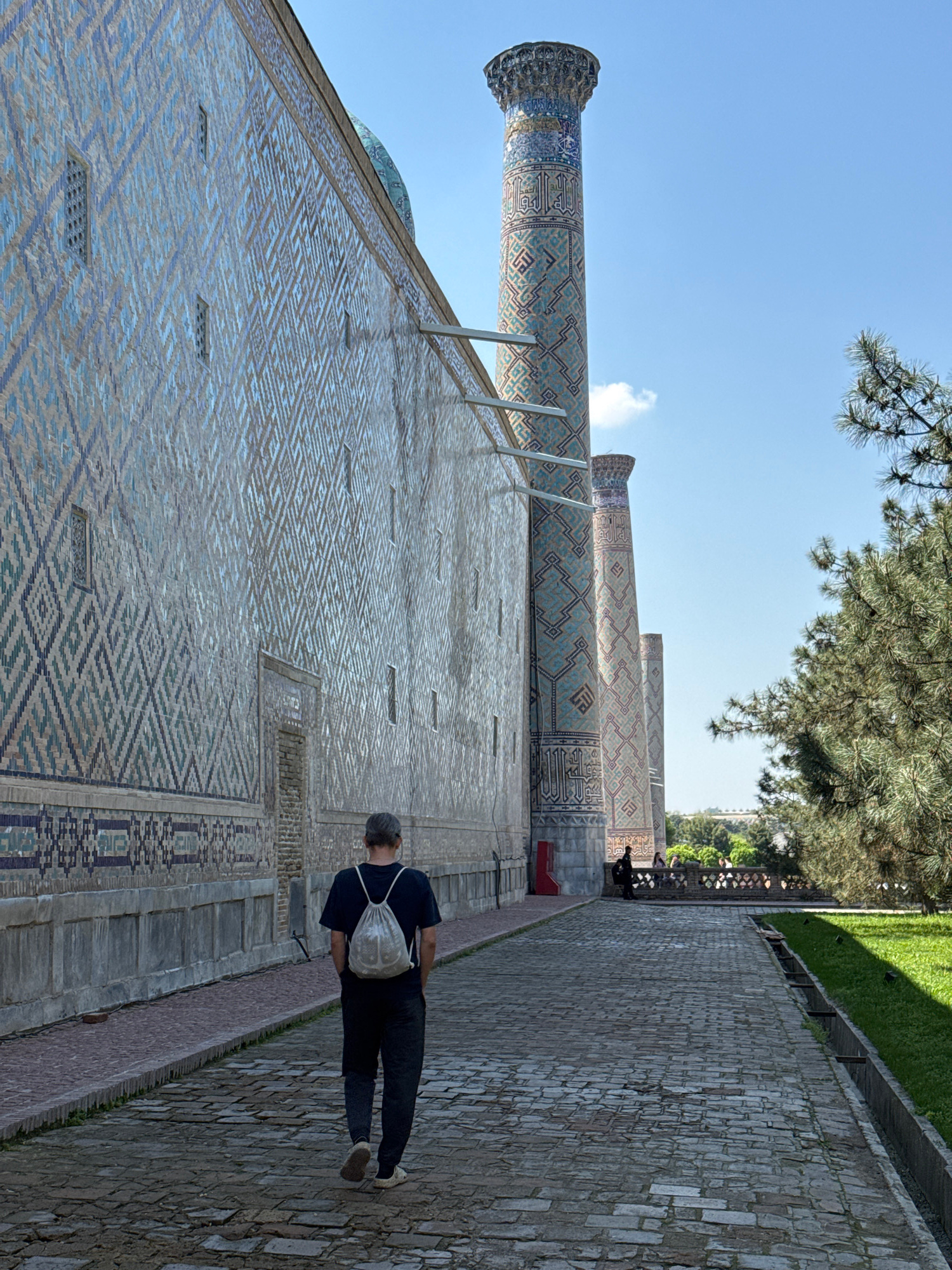 A person walks along a cobblestone path past the Bibi Khanym Mosque in Samarkand City, Uzbekistan. The mosque's exterior is adorned with intricate geometric patterns and tilework in shades of blue and…read more