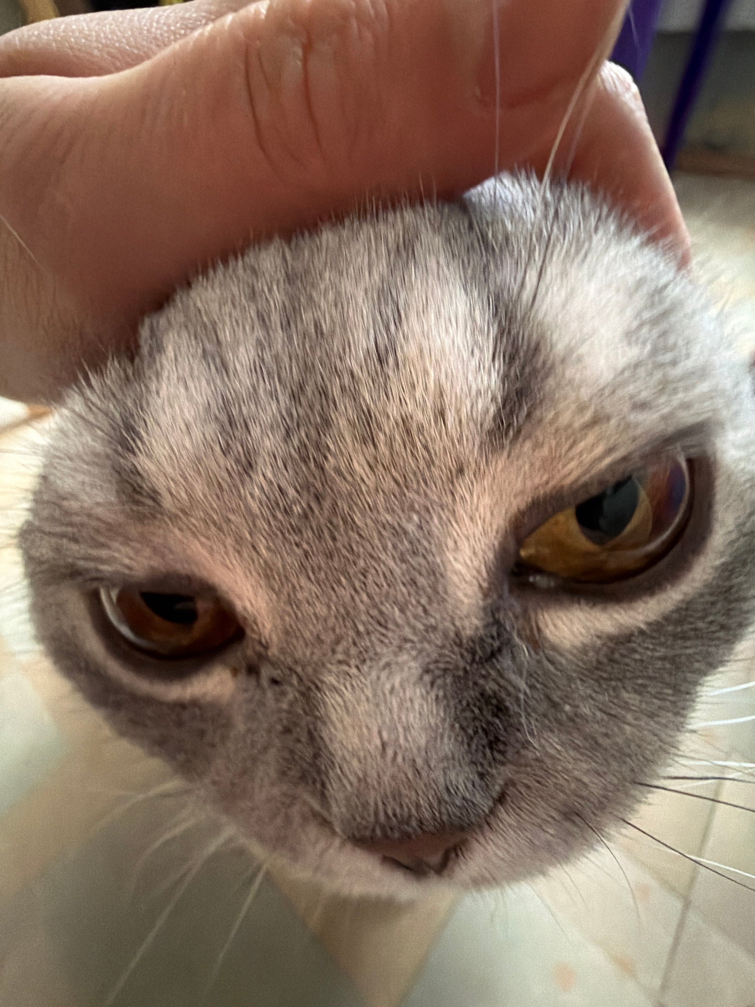 The image presents a very close-up, eye-level portrait of a domestic cat's face, held by a human hand. The cat features short, dense grey fur with subtle tabby markings, and prominent, large, round am…read more