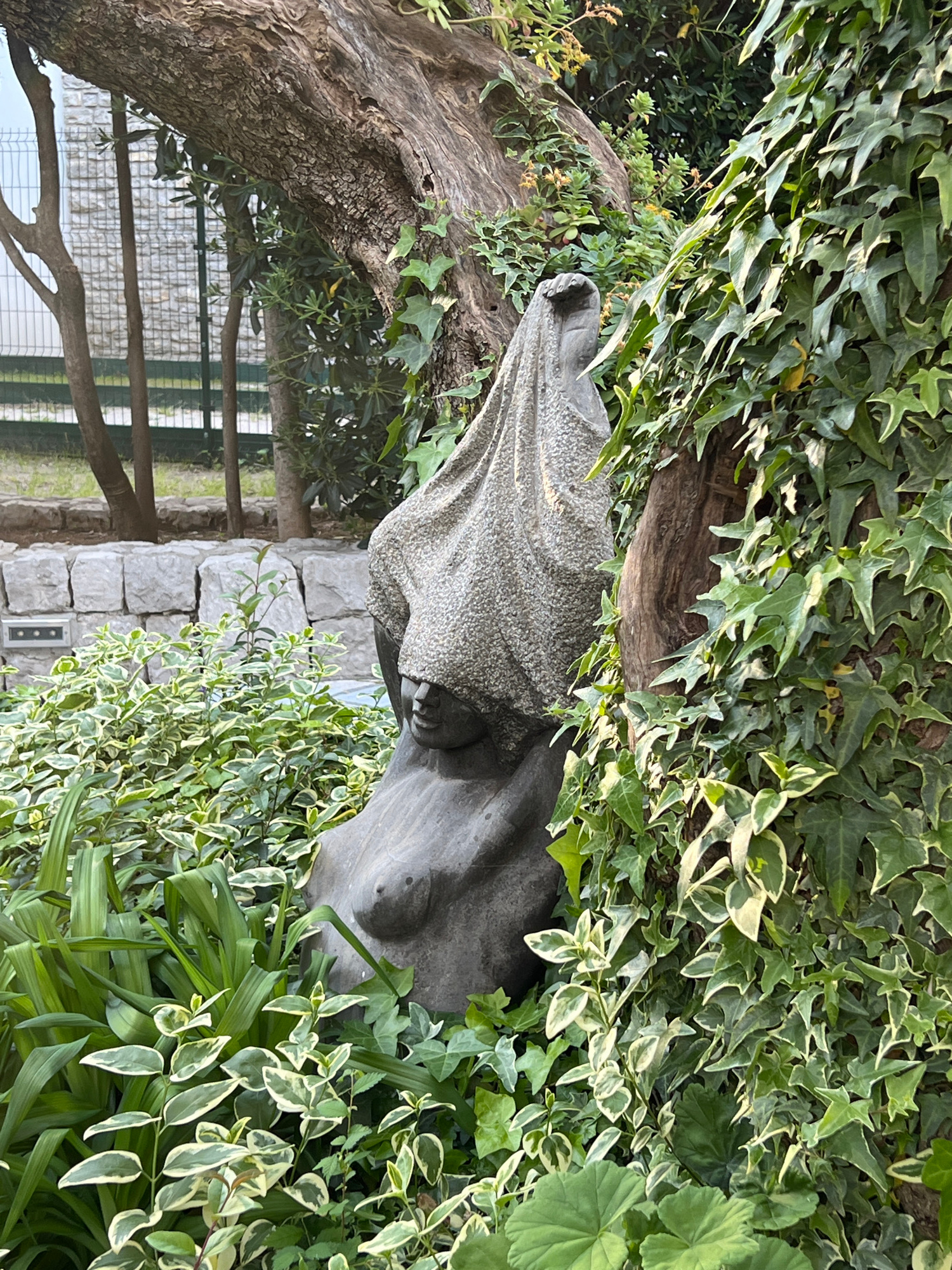 The image depicts a statue of a veiled woman, possibly made of concrete or a similar stone material, surrounded by lush green foliage, including ivy and other leafy plants. The statue is positioned ne…read more