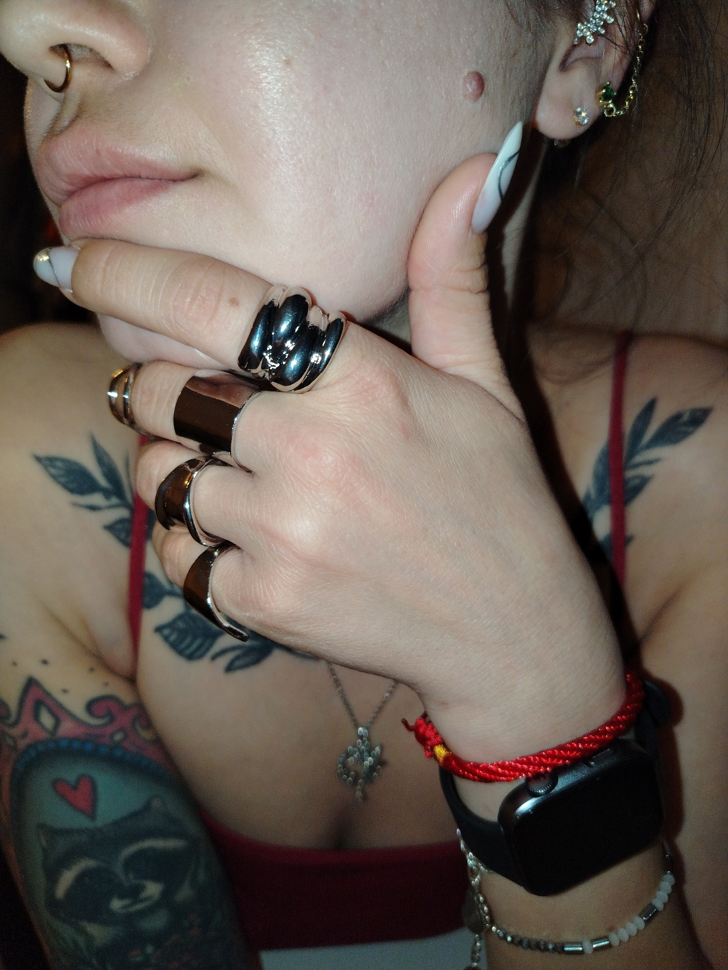 A person with pale skin is shown from the chest up, adorned with jewelry and tattoos. A gold nose ring is visible in the left nostril, and multiple earrings decorate the right ear. The person's left hβ¦read more