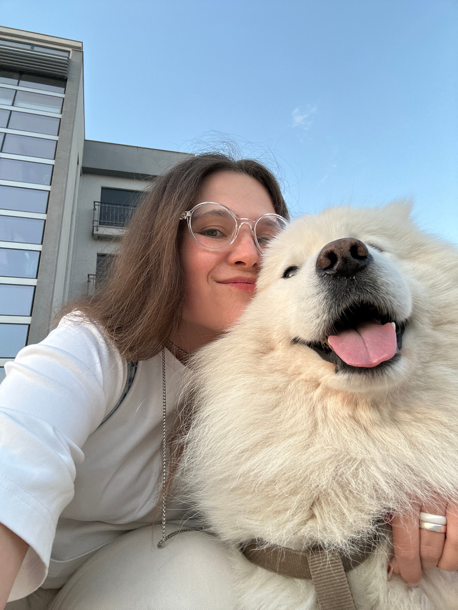 A medium shot angled upward shows a woman holding a Samoyed dog close to her face. The woman has brown hair, fair skin, and is wearing round-rimmed glasses. She is wearing a white long-sleeved shirt a…read more