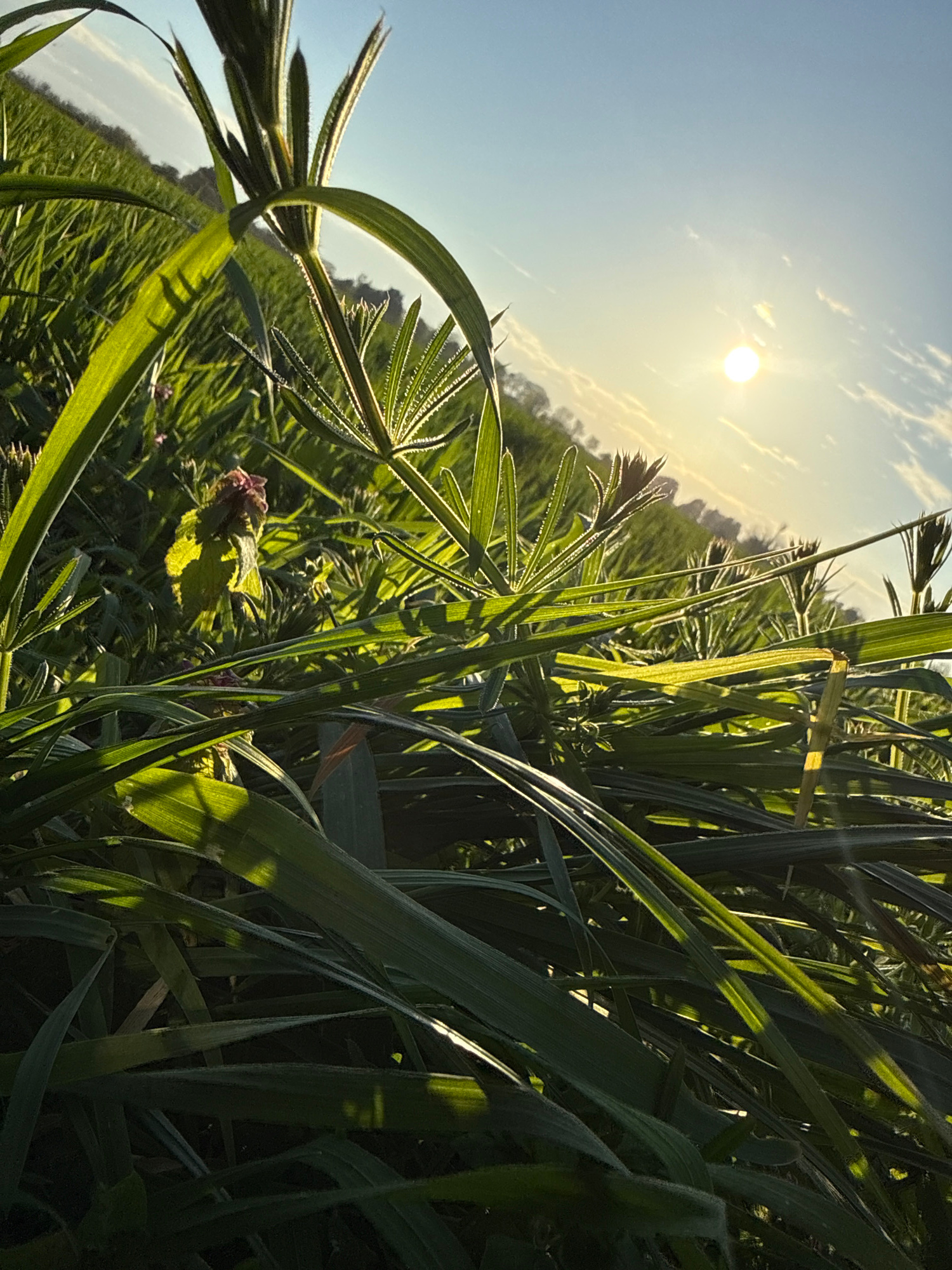 The image depicts a close-up, ground-level view of a grassy field in bright sunlight. The sun is visible in the upper left corner of the image, with a clear blue sky and some clouds. Tall green grasse…read more