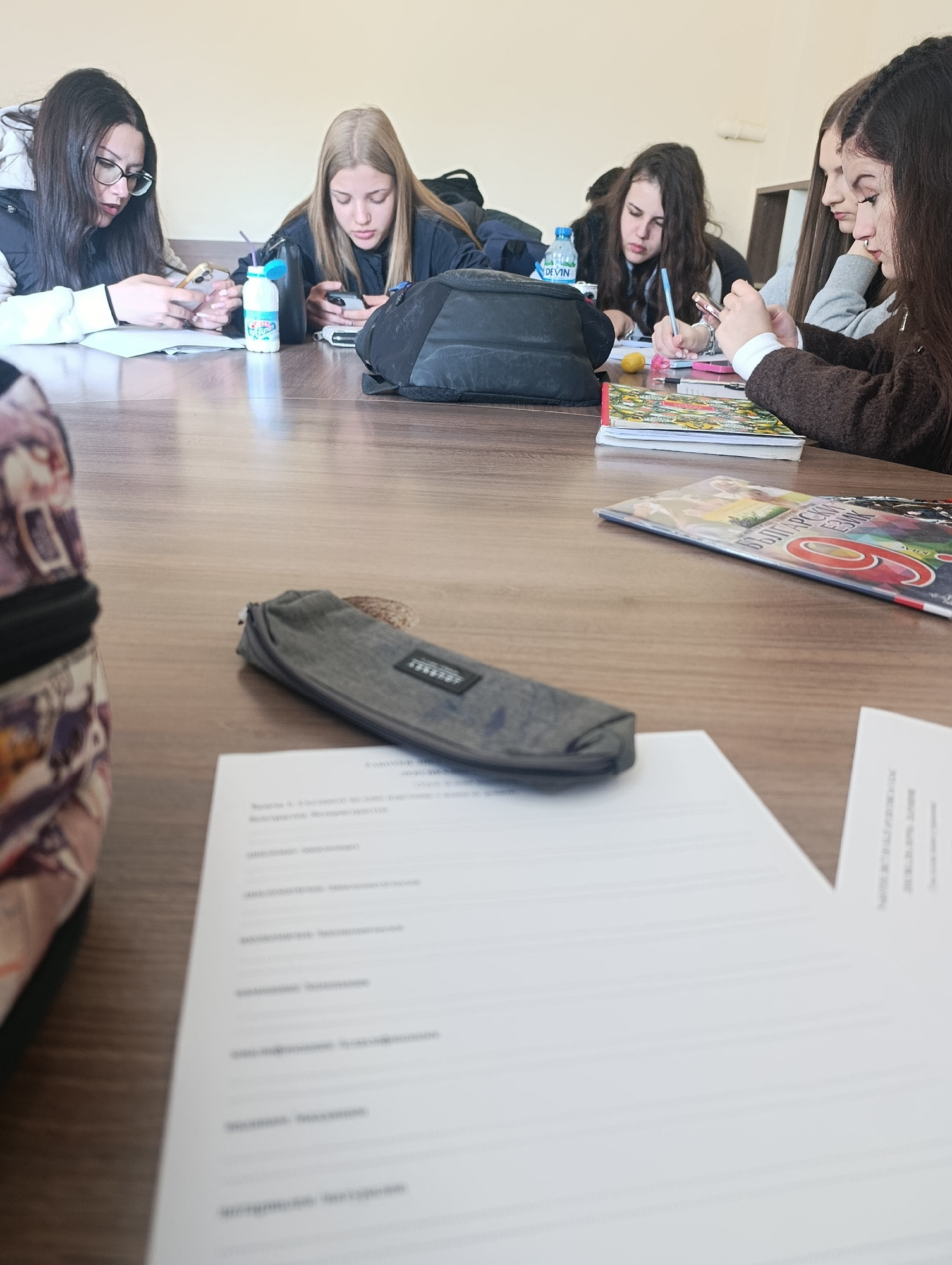 Five young women are seated around a long, light-brown wooden table. They appear to be in a classroom or study hall, possibly in Silistra, Bulgaria, based on the textbook on the table. The women are e…read more