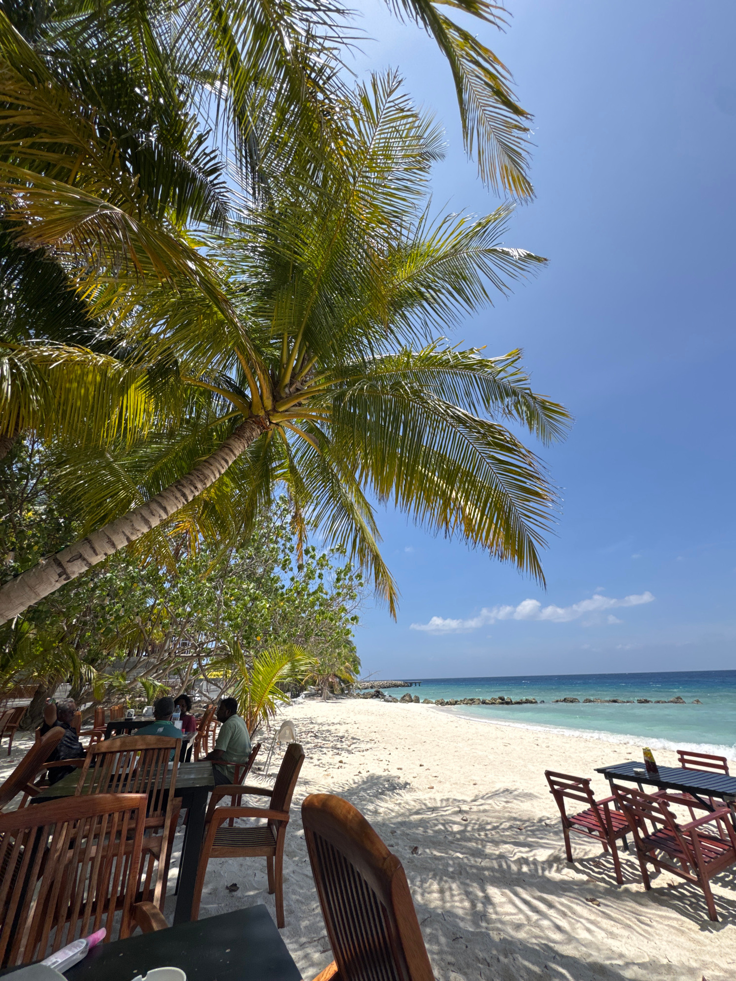 The image shows a beach scene in Ukulhas, Maldives. A palm tree dominates the left side of the frame, its fronds reaching towards a clear blue sky. The beach, composed of white sand, extends towards t…read more