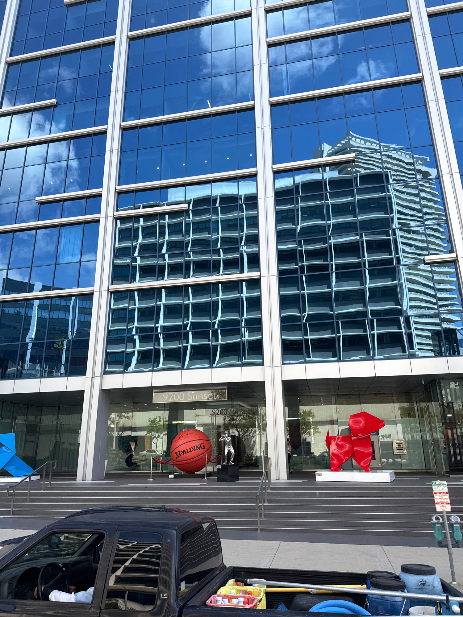 The image captures the entrance of the building at 9200 Sunset Boulevard in West Hollywood, USA. A modern glass-fronted building reflects an adjacent structure in its windows. The building's entrance…read more