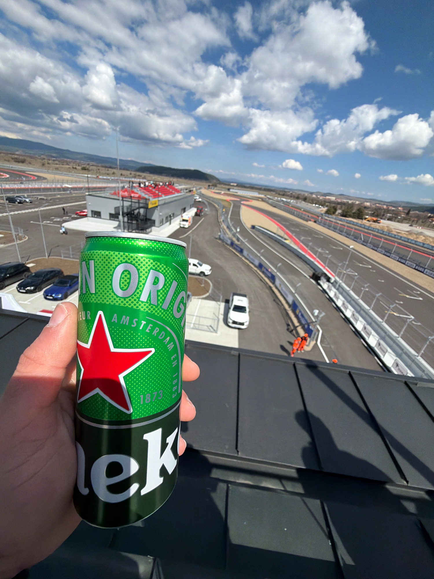 A person is holding a green Heineken beer can with a red star logo in their right hand. The background features a Formula 1 race track, specifically the Circuit de Barcelona-Catalunya, located in Mont…read more
