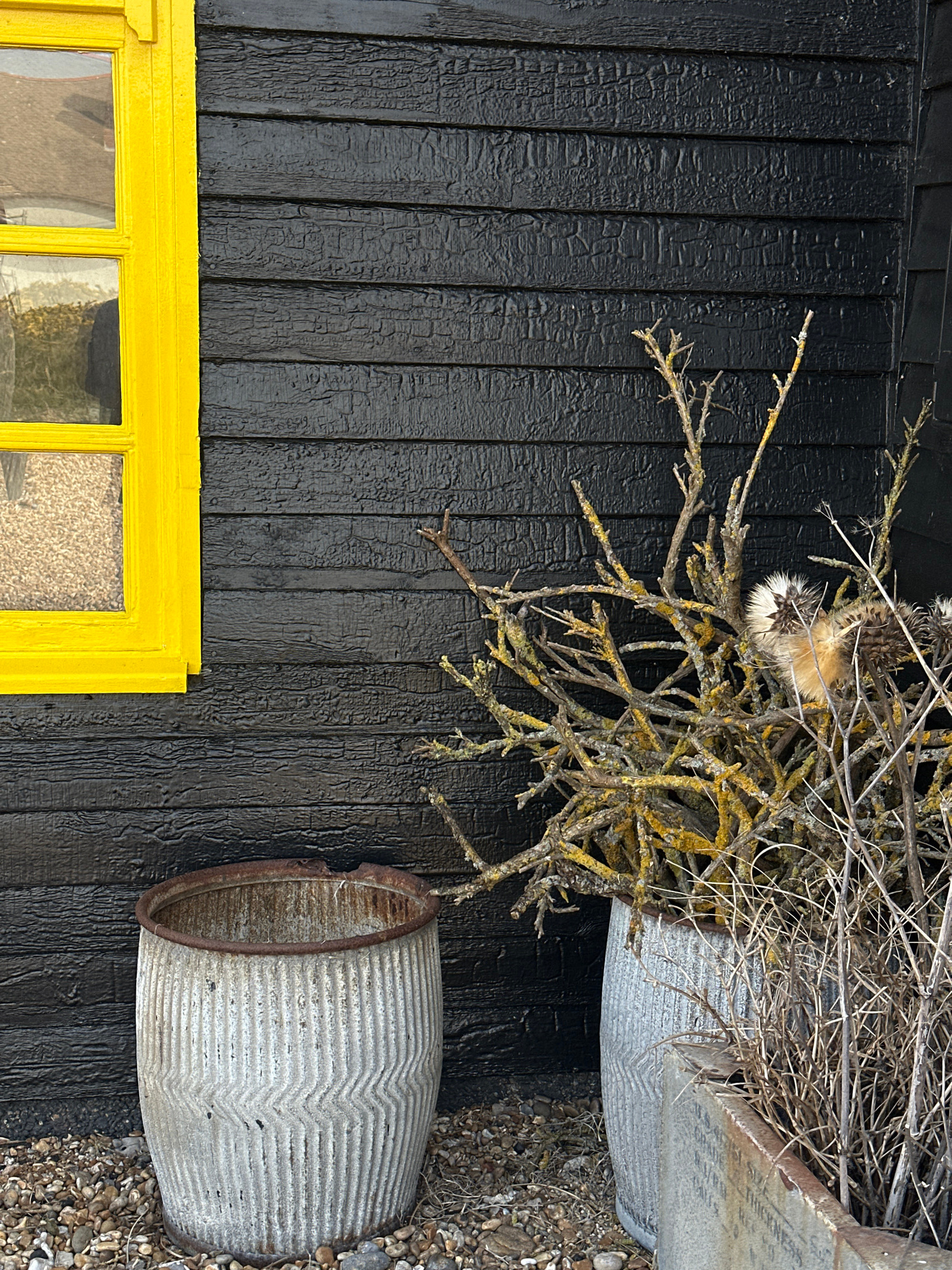 The image depicts a close-up view of a building's exterior. The wall is clad in charred black timber planks. A yellow window frame is visible in the lower left corner, featuring what looks like glass…read more